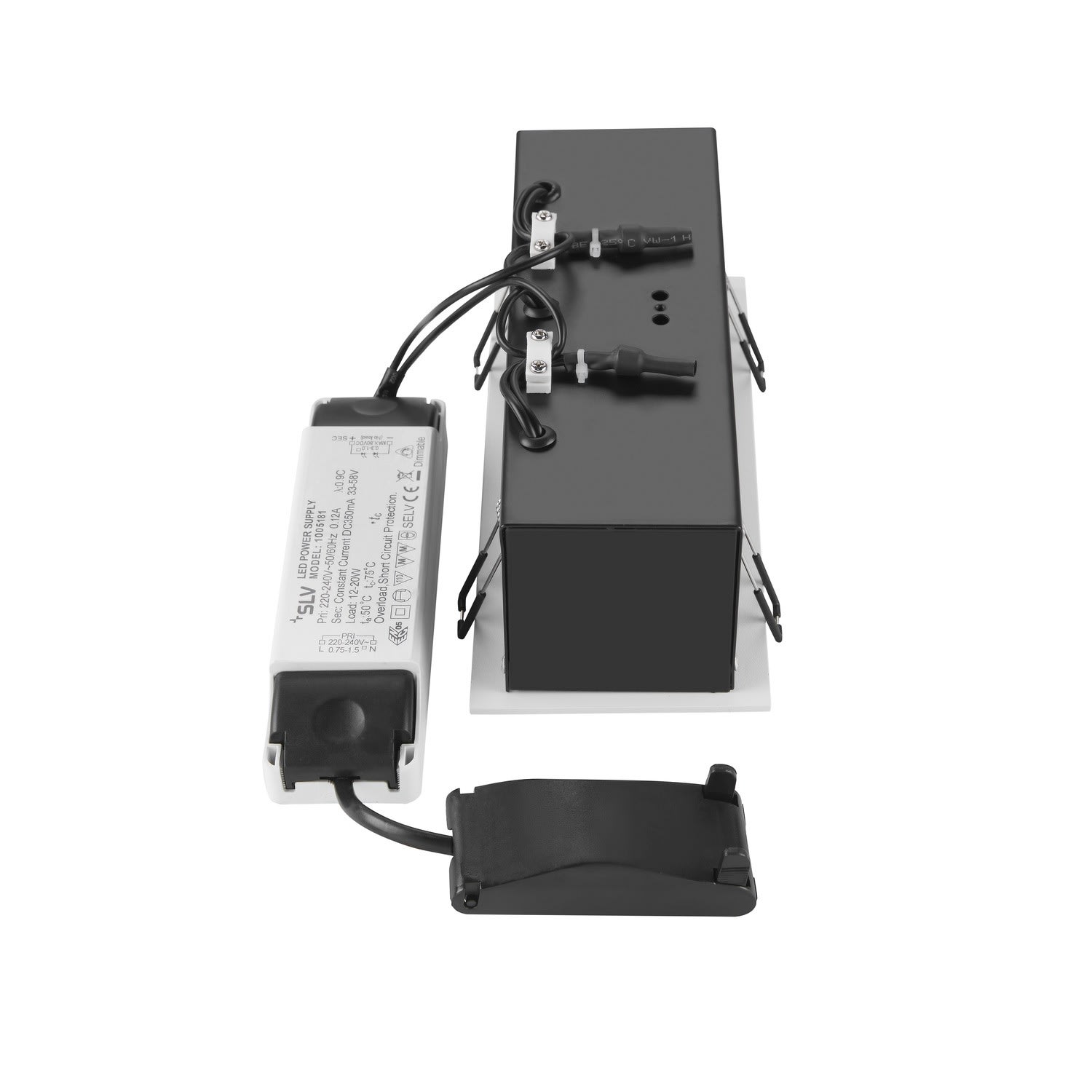 Intérieur plafonnier encastré avec corps lumineux LED fixe. Matériau principal: aluminium et acier, Couleur: blanc et noir, Dimmable: Variateur en début de phase,Variateur en fin de phase, Form: carré, Puissance assignée: 20 W, Flux lumineux assigné: 2350 lm, Température de couleur (CCT): 3000K, Indice général de rendu des couleurs (IRC) Ra: 90, Maintien du flux lumineux: L80B10 ≥ 50000 h, Classe de protection (EN 61140): II, Indice de protection (DIN EN 60529): IP20, Degré de résistance aux chocs selon IEC 62262: IK02, Tension d'alimentation: 220-240V ~50/60 Hz, Diamètre de la découpe: 3 cm, Dimension (L/W/H): ( 21 / 9 / 8.3 cm ), Poids: 0.777 kg. Le produit répond aux exigences essentielles des directives européennes applicables et de la loi sur la sécurité des produits et porte le marquage CE.SLV Référence 1007568 / EAN 4024163278836