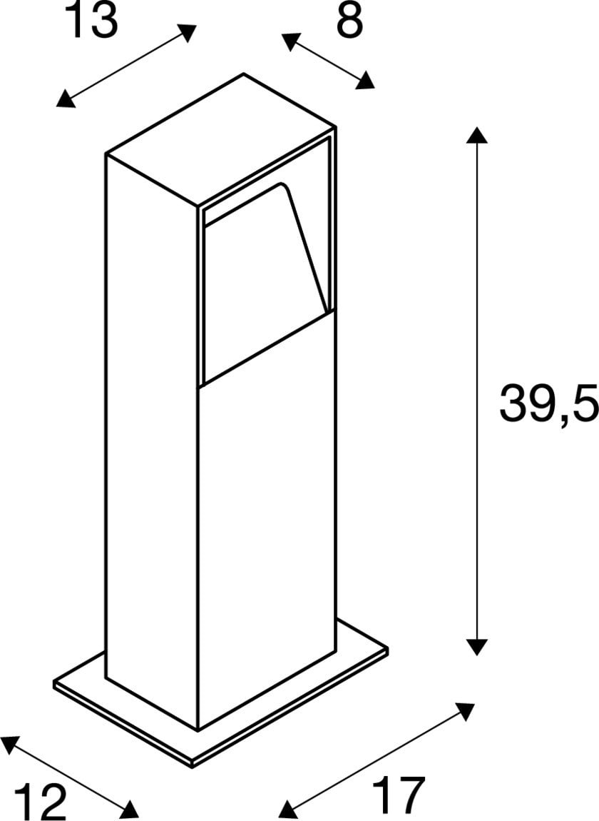 Extérieur lampadaires avec corps lumineux LED fixe. Matériau principal: Aluminium, Couleur: anthracite, Form: rectangulaire, Puissance assignée: 9.5 W, Flux lumineux assigné: 570 lm, Température de couleur (CCT): 3000K, Indice général de rendu des couleurs (IRC) Ra: 80, Maintien du flux lumineux: L70B50 ≥ 40000 h, Classe de protection (EN 61140): I, Indice de protection (DIN EN 60529): IP65, donc protection contre l'intrusion de la poussière et protection contre les jets d'eau de toutes directions, Degré de résistance aux chocs selon IEC 62262: IK04, Tension d'alimentation: 100-240V ~50/60Hz sek. 500mA, Dimension (L/W/H): ( 8 / 13 / 39.5 cm ), Poids: 1.99 kg. Le produit répond aux exigences essentielles des directives européennes applicables et de la loi sur la sécurité des produits et porte le marquage CE.SLV Référence 232115 / EAN 4024163132442