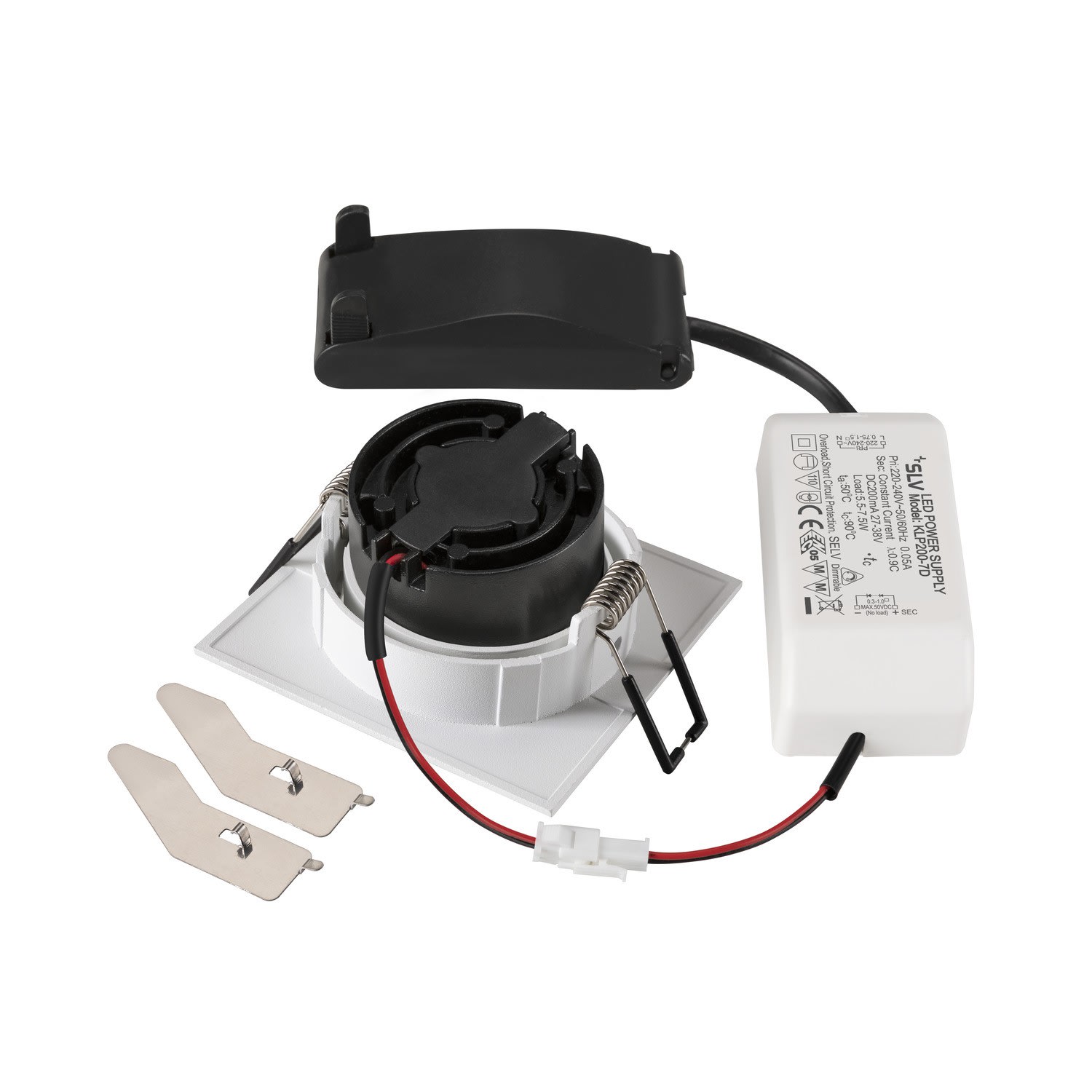 Intérieur plafonnier encastré avec corps lumineux LED fixe. Matériau principal: aluminium, Couleur: blanc, Dimmable: Variateur en début de phase,Variateur en fin de phase, Form: carré, Puissance assignée: 8.3 W, Flux lumineux assigné: 705 lm, Température de couleur (CCT): 2700K, Indice général de rendu des couleurs (IRC) Ra: 90, Maintien du flux lumineux: L80B10 ≥ 50000 h, Classe de protection (EN 61140): II, Indice de protection (DIN EN 60529): IP20, Degré de résistance aux chocs selon IEC 62262: IK02, Tension d'alimentation: 220-240V ~50/60 Hz, Diamètre de la découpe: 6.8 cm, Dimension (L/W/H): ( 8.2 / 8.2 / 4 cm ), Poids: 0.21 kg. Le produit répond aux exigences essentielles des directives européennes applicables et de la loi sur la sécurité des produits et porte le marquage CE.SLV Référence 1007395 / EAN 4024163277723