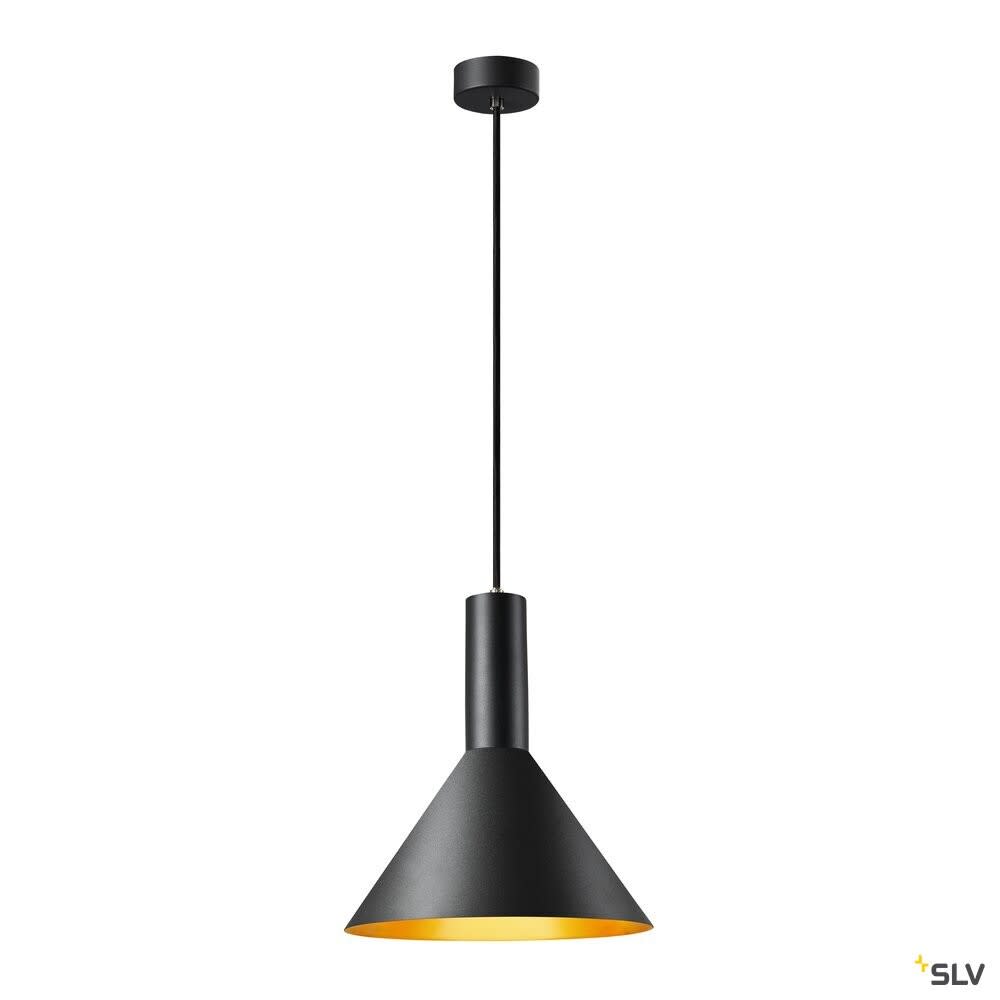 Intérieur suspensions. Matériau principal: Aluminium, Couleur: or et noir, Culot: E27, Form: conique, Puissance assignée: 23 W, Classe de protection (EN 61140): I, Indice de protection (DIN EN 60529): IP20, donc Protection contre les corps étrangers solides d'un diamètre supérieur à 12,5 mm, Tension d'alimentation: 220-240V ~50/60 Hz, Diamètre du luminaire: 27.5 cm, Dimension (L/W/H): ( 27.5 / 27.5 / 32 cm ), Poids: 0.754 kg. Le produit répond aux exigences essentielles des directives européennes applicables et de la loi sur la sécurité des produits et porte le marquage CE.SLV Référence 1002949 / EAN 4024163231435