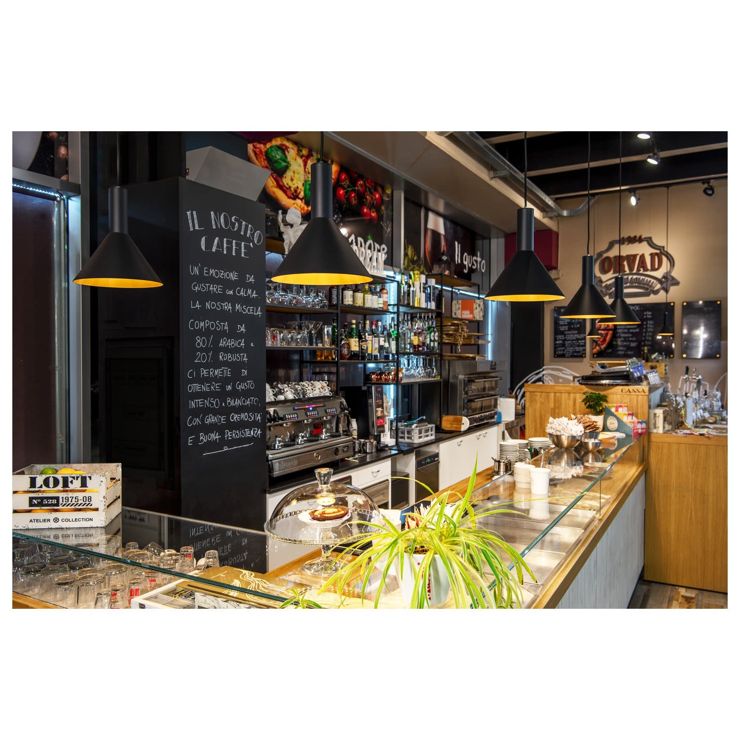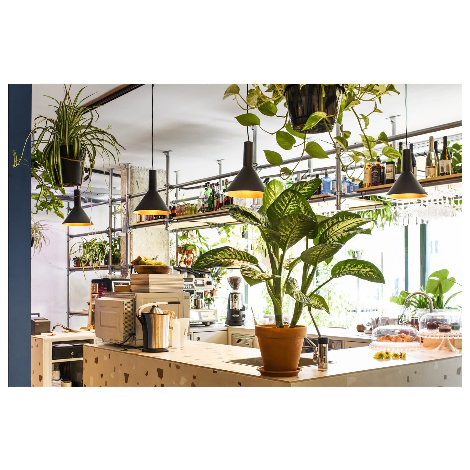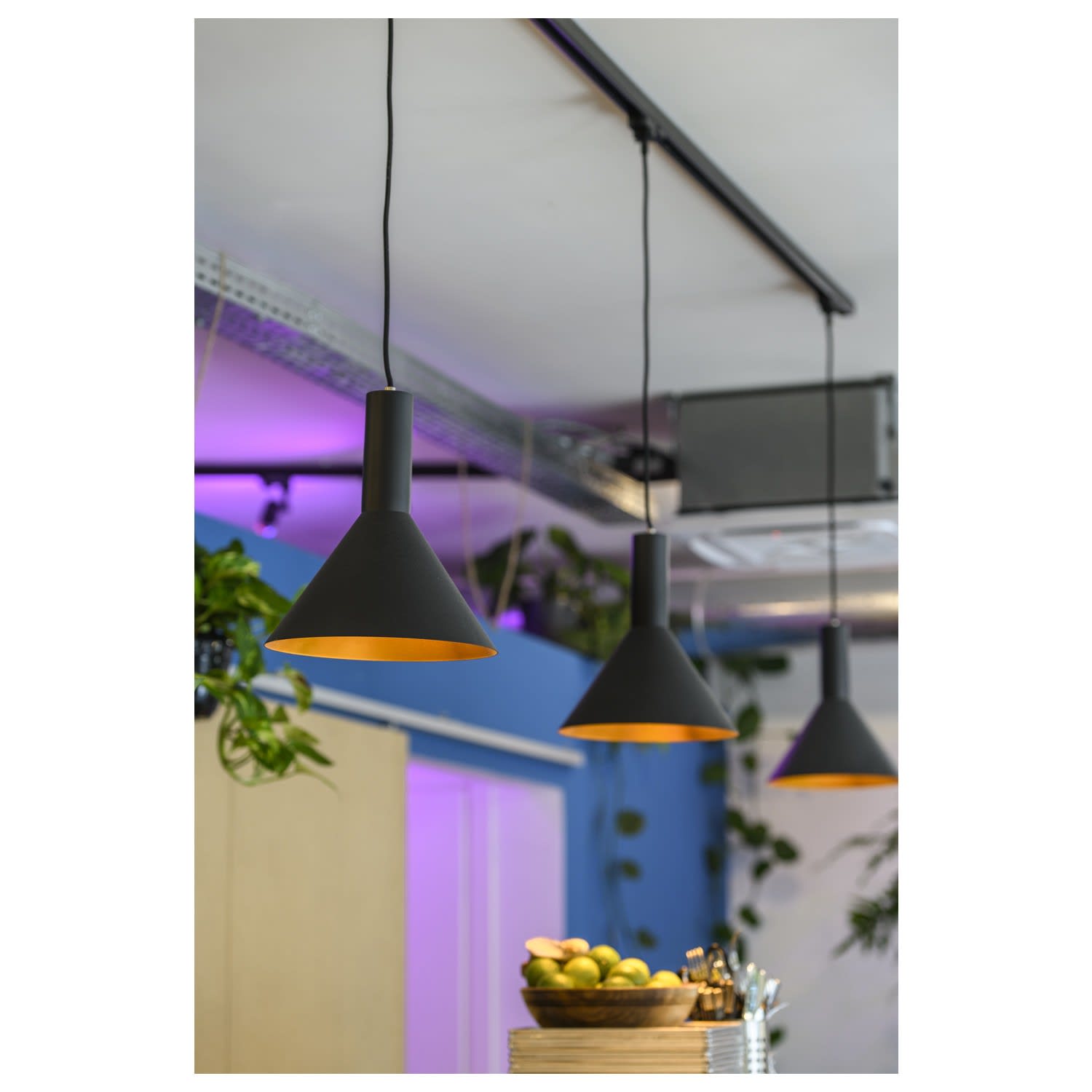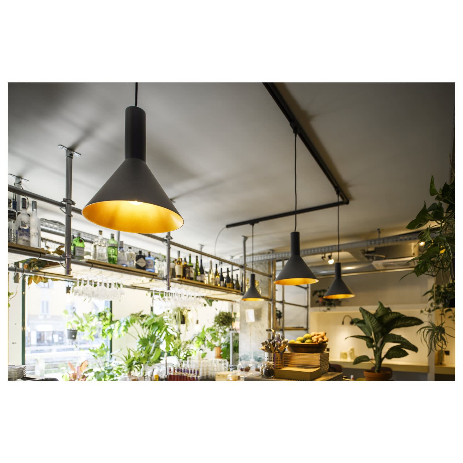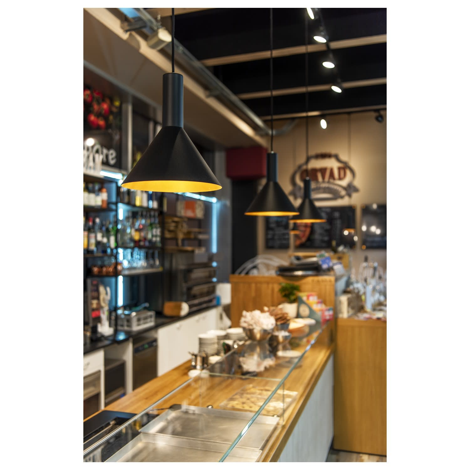 La gamme PHELIA offre de nombreuses possibilités avec des suspensions de plusieurs diamètres et un lampadaire. Cette gamme séduit par un abat-jour conique de couleur noire/dorée, élégant et un aspect épuré. La douille E27 intégrée au luminaire permet de l’utiliser avec des sources LED ou basse consommation.