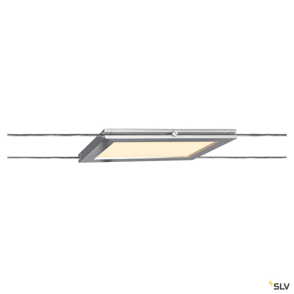 Intérieur spot pour système de câble tendu avec corps lumineux LED fixe pour le Système de câble tendu. Matériau principal: plastique et Aluminium, Couleur: chrome, Form: rectangulaire, Puissance assignée: 9.8 W, Flux lumineux assigné: 750 lm, Température de couleur (CCT): 2700K, Indice général de rendu des couleurs (IRC) Ra: 90, Maintien du flux lumineux: L70B50 ≥ 30000 h, Classe de protection (EN 61140): III, Tension d'alimentation: 12V ~50Hz, Dimension (L/W/H): ( 24 / 17.5 / 1.7 cm ), Poids: 0.44 kg. Le produit répond aux exigences essentielles des directives européennes applicables et de la loi sur la sécurité des produits et porte le marquage CE.SLV Référence 1002866 / EAN 4024163230629