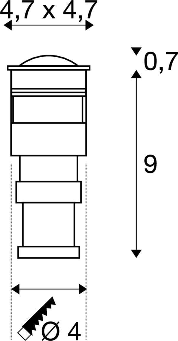 Extérieur encastré de sol avec corps lumineux LED fixe. Matériau principal: Inox 316 et Verre, Couleur: inox, Form: rectangulaire, Puissance assignée: 1 W, Flux lumineux assigné: 45 lm, Température de couleur (CCT): 3000K, Indice général de rendu des couleurs (IRC) Ra: 90, Maintien du flux lumineux: L70B50 ≥ 30000 h, Classe de protection (EN 61140): III, Indice de protection (DIN EN 60529): IP67, donc protection contre la pénétration de la poussière et protection contre l'immersion temporaire dans l'eau, Degré de résistance aux chocs selon IEC 62262: IK08, Tension d'alimentation: 350mA, Diamètre de la découpe: 4 cm, Dimension (L/W/H): ( 4.7 / 4.7 / 6.7 cm ), Poids: 0.314 kg. Le produit répond aux exigences essentielles des directives européennes applicables et de la loi sur la sécurité des produits et porte le marquage CE.SLV Référence 228342 / EAN 4024163127660