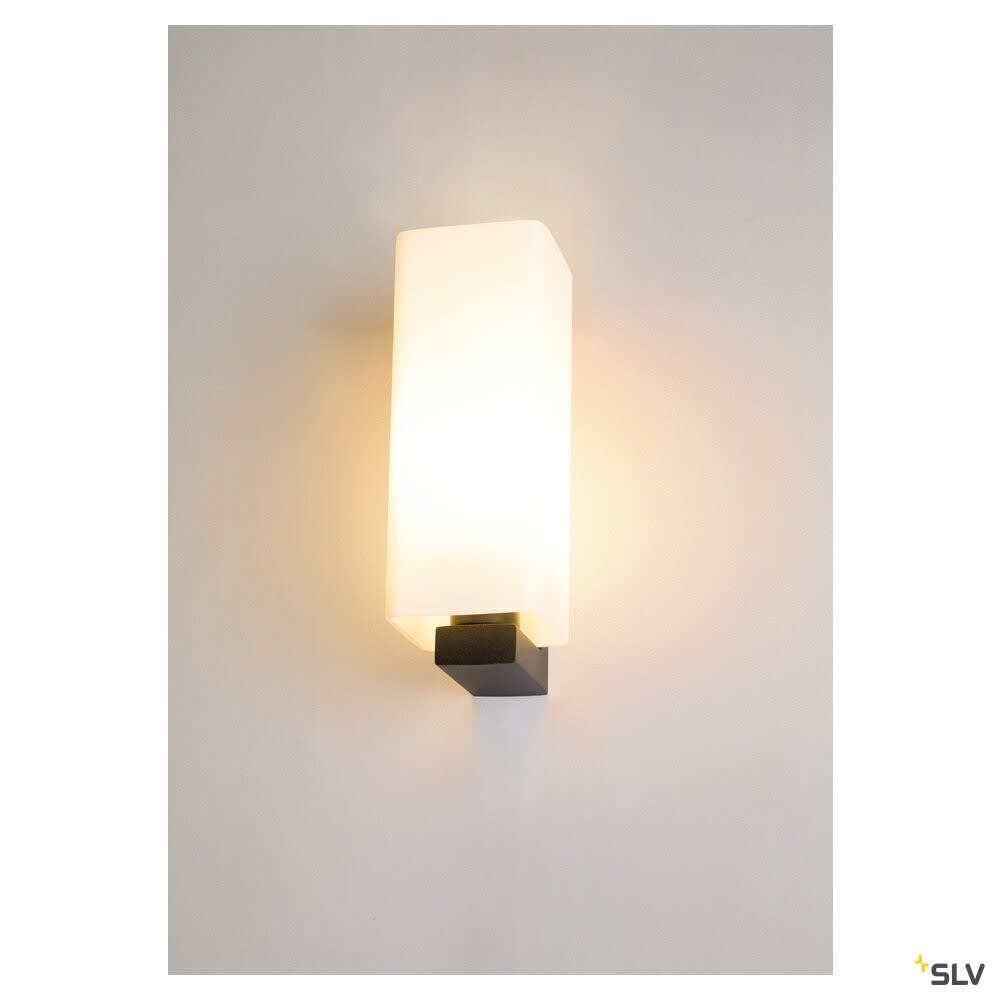 Intérieur appliques. Matériau principal: Acier et Verre, Couleur: noir et dépoli, Culot: E27, Form: rectangulaire, Puissance assignée: 40 W, Classe de protection (EN 61140): I, Indice de protection (DIN EN 60529): IP20, donc Protection contre les corps étrangers solides d'un diamètre > 12,5mm, Tension d'alimentation: 220-240V ~50/60 Hz, Dimension (L/W/H): ( 12.5 / 9.5 / 28 cm ), Poids: 1.45 kg. Le produit répond aux exigences essentielles des directives européennes applicables et de la loi sur la sécurité des produits et porte le marquage CE.SLV Référence 1003430 / EAN 4024163235877