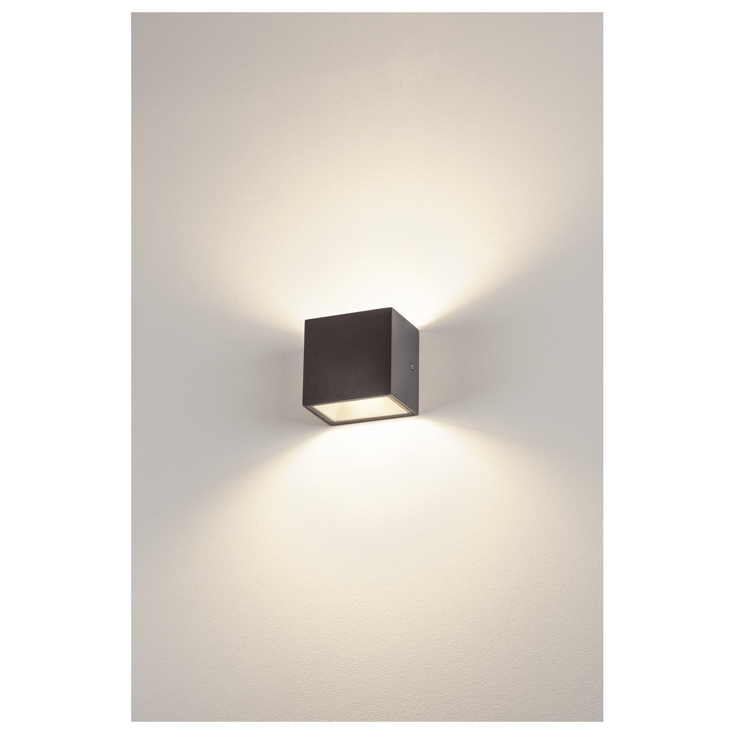Applique cubique SITRA CUBE en aluminium laqué. La position des deux douilles intégrées au luminaire permet de générer deux faisceaux lumineux identiques bidirectionnels (effet UP/DOWN). Conçue pour l'extérieur grâce à l'indice de protection IP44. Le raccordement électrique du luminaire, disponible en plusieurs coloris, s'effectue sur la tension secteur 230V.