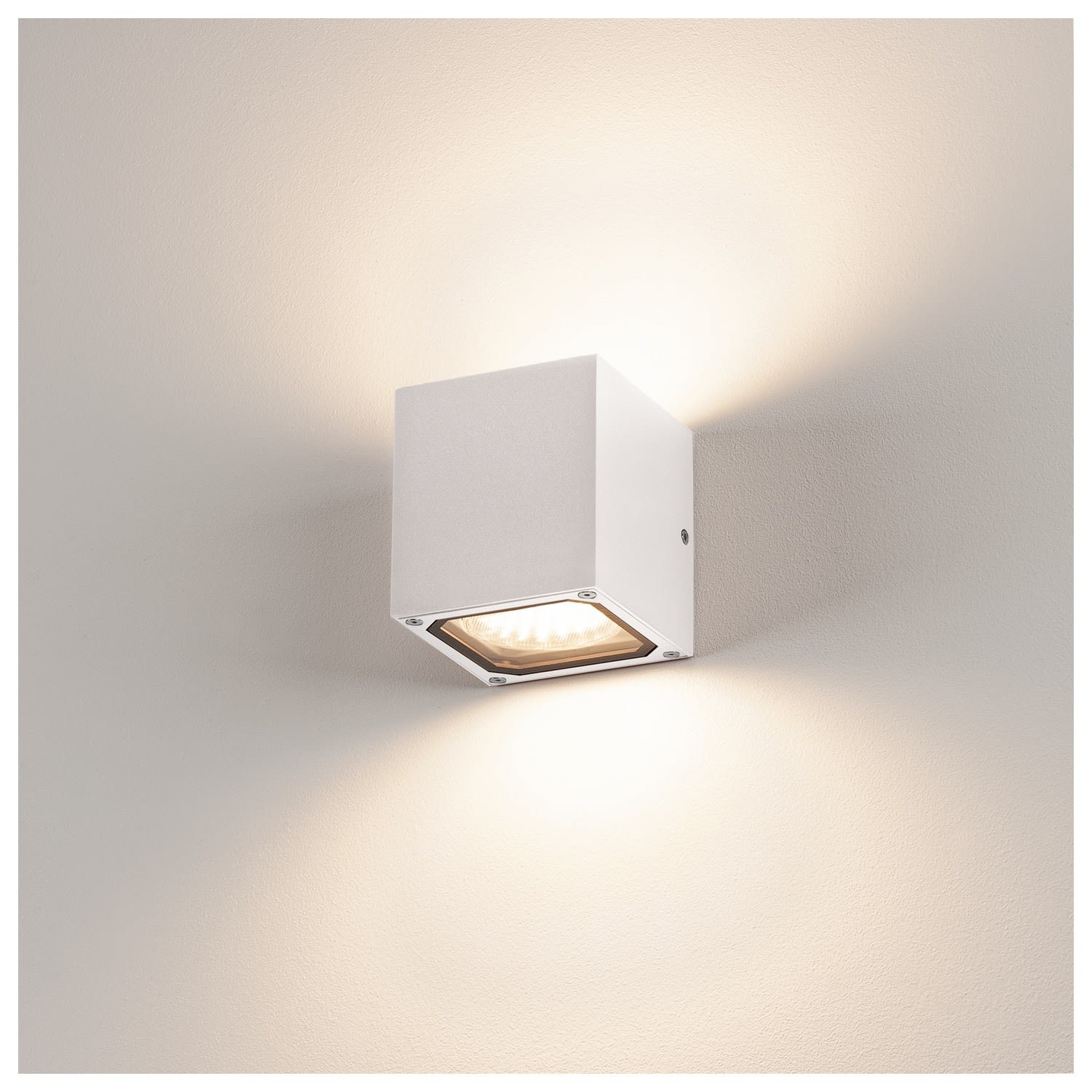 Applique cubique SITRA CUBE en aluminium laqué. La position des deux douilles intégrées au luminaire permet de générer deux faisceaux lumineux identiques bidirectionnels (effet UP/DOWN). Conçue pour l'extérieur grâce à l'indice de protection IP44. Le raccordement électrique du luminaire, disponible en plusieurs coloris, s'effectue sur la tension secteur 230V.