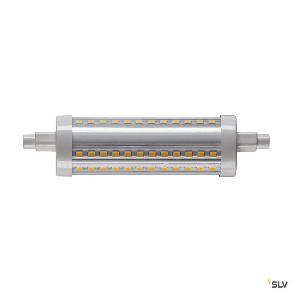Ampoule LED. Matériau principal: polycarbonate (PC), Couleur: gris, Culot: R7s 118mm, Dimmable: Variateur en fin de phase, Puissance assignée: 15 W, Flux lumineux assigné: 2000 lm, Température de couleur (CCT): 3000K, Indice général de rendu des couleurs (IRC) Ra: 90, Classe d'efficacité énergétique: E, Maintien du flux lumineux: L70B50 ≥ 25000 h, Tension d'alimentation: 220-240V ~50/60 Hz, Diamètre du luminaire: 2.9 cm, Dimension (L/W/H): ( 11.8 / 2.9 / 2.9 cm ), Poids: 0.09 kg. Le produit répond aux exigences essentielles des directives européennes applicables et de la loi sur la sécurité des produits et porte le marquage CE.SLV Référence 1005288 / EAN 4024163253697