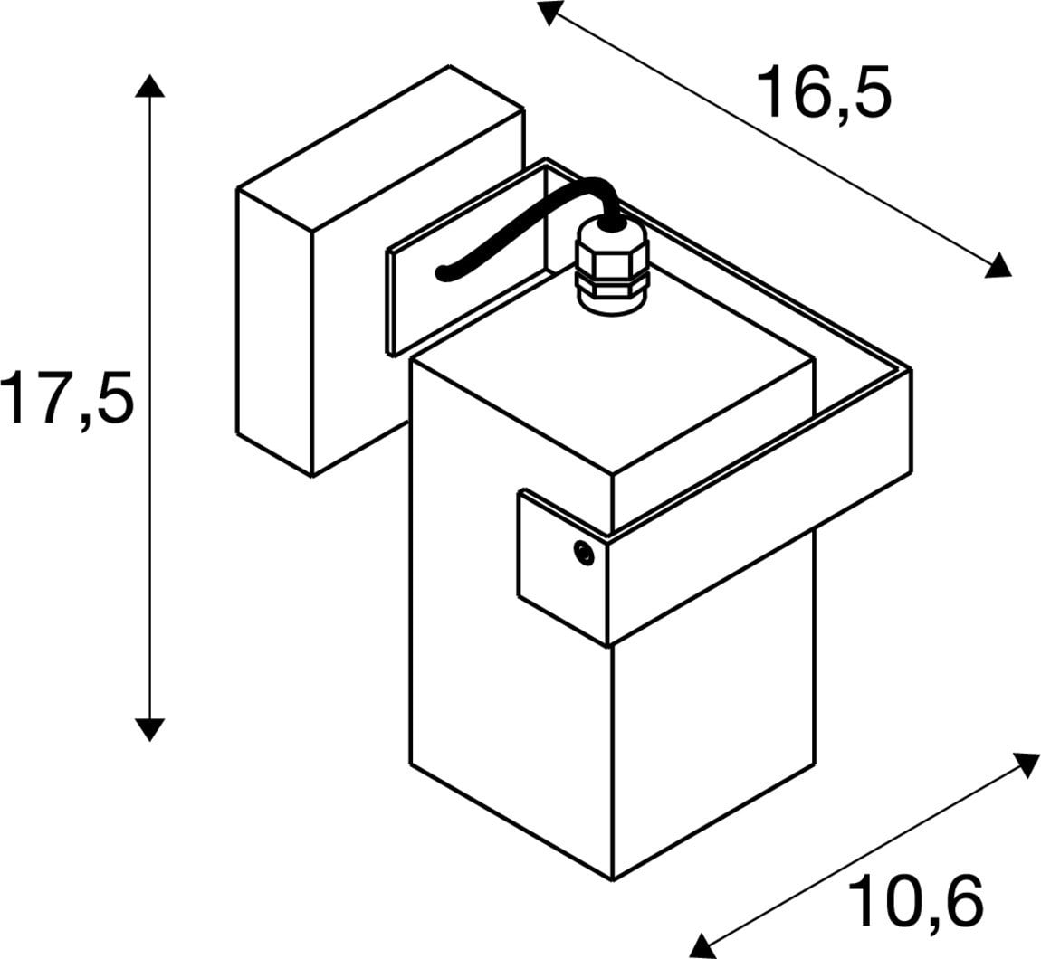 Extérieur applique murale ou de plafond. Matériau principal: Aluminium et Verre, Couleur: anthracite et transparent, Culot: GU10, Form: rectangulaire, Puissance assignée: 7 W, Classe de protection (EN 61140): I, Indice de protection (DIN EN 60529): IP65, donc protection contre l'intrusion de la poussière et protection contre les jets d'eau de toutes directions, Degré de résistance aux chocs selon IEC 62262: IK02, Tension d'alimentation: 220-240V ~50/60 Hz, Dimension (L/W/H): ( 17.5 / 10.6 / 16.5 cm ), Poids: 1.108 kg. Le produit répond aux exigences essentielles des directives européennes applicables et de la loi sur la sécurité des produits et porte le marquage CE.SLV Référence 1004653 / EAN 4024163248037