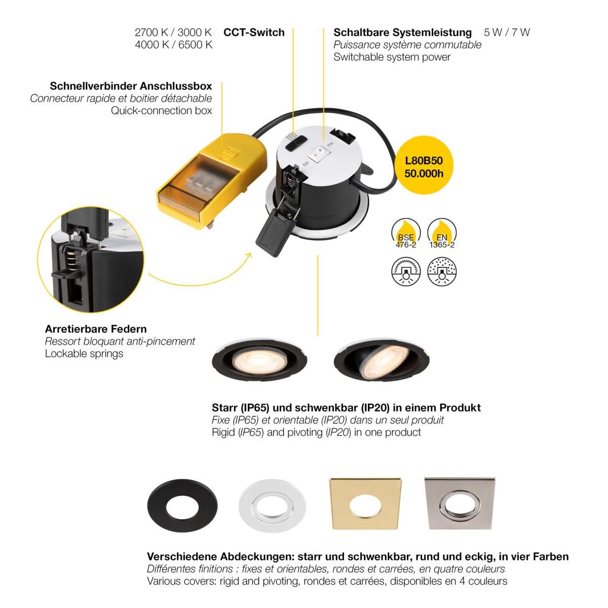 Différentes propriétés réunies : voilà l'UNIVERSAL DOWNLIGHT de SLV. La température de couleur peut être réglée sur quatre niveaux via le CCT-Switch. Choisir une puissance de 5 W ou de 7 W est tout aussi aisé. Et grâce aux ressorts verrouillables et au boîtier de raccordement rapide, le montage du downlight est aussi simple que rapide. Les caches disponibles séparément, ronds ou carrés et de différentes couleurs, permettent d'utiliser le UNIVERSAL DOWNLIGHT comme downlight fixe avec un indice de protection IP65 ou comme downlight inclinable IP20. Une housse adaptée est déjà comprise dans la livraison et permet une utilisation immédiate.