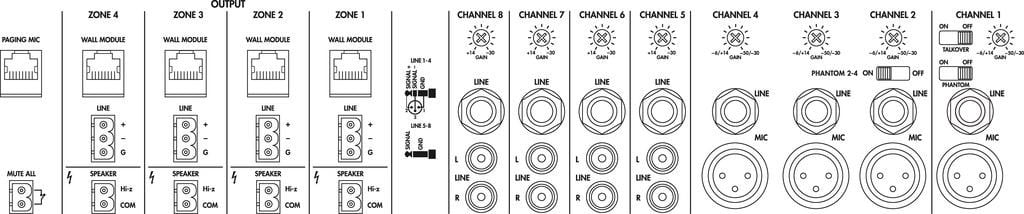 - 4 entrées Mic/Ligne réglables avec égaliseur 3 voies et alimentation fantôme 24 V commutable