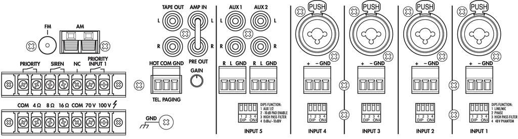 - 4 entrées Mic / Ligne, configurables par interrupteurs DIP (Mic/Line, Phase, filtre passe-haut, alimentation fantôme 48 V)