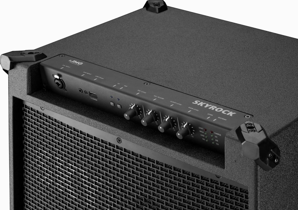 - Fonctionnement via branchement secteur ou accu plomb gel 12 V/18 Ah, disponible en option, (jusqu'à 40 heures de durée de fonctionnement à un volume normal, jusqu'à 10 heures à plein volume), avec LED témoin d'état de charge