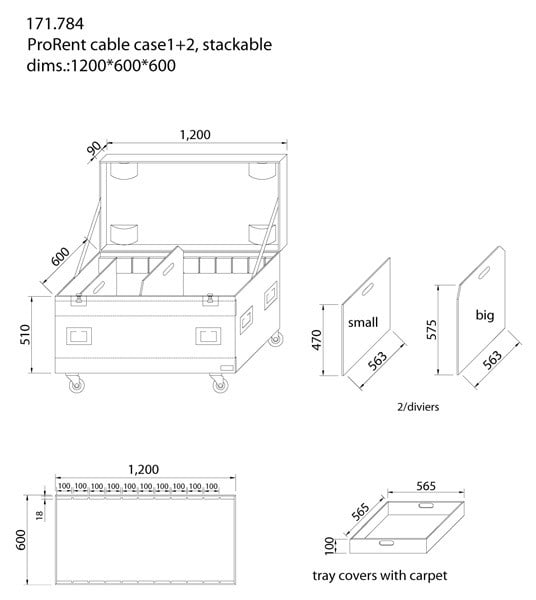 Un coffre solide pour toutes les applications “Roadie“. Plus de cordons, câbles, micros, ... qui traînent. En multiplex mélaminé solide. Avec 8 poignées, 2 fermetures papillons et roulettes 3,5“ (dont 2 avec frein). Avec parois de séparation déplaçables. Intérieur tissu.