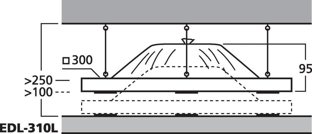 - Dimensions 300 mm x 300 mm, hauteur nécessaire au-dessus du plafond pour un support direct : > 10 cm, pour une suspension au-dessus du plafond : > 25 cm