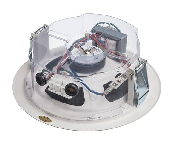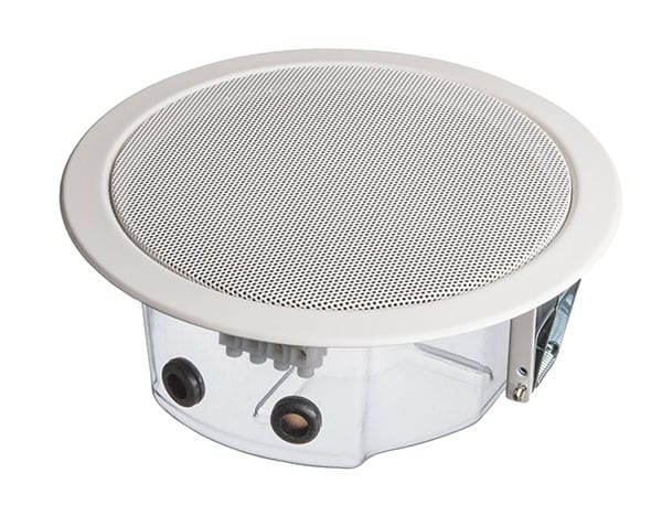 Haut-parleur de plafond avec protection des contacts en plastique PET de haute qualité pour les applications d'alarme vocale, certifié EN 54-24, adapté aux annonces vocales et à la musique d'ambiance avec une excellente qualité sonore.Puissance de 6 W, haut-parleur large bande de 130 mm, transformateur de 100 V avec 3 réglages de puissance.Grâce à un système de flux d'air innovant, le DL-E offre des caractéristiques sonores dignes d'un haut-parleur de basse conventionnel. Une méthode de construction extrêmement plate permet une faible profondeur de montage de seulement 70 mm, avec un poids de produit inférieur à 1 kg. Pour une fiabilité accrue, la membrane est imprégnée contre l'humidité.Le haut-parleur est également protégé par l'indice de protection IP 21C contre les risques de sécurité liés aux influences environnementales. Montage rapide et facile grâce aux pinces à ressort. Parfaitement adapté aux installations où la profondeur d'installation est très limitée.La protection de contact innovante en plastique PET est incluse dans la livraison et protégée par un brevet européen (publication n° 2768238). Cette enceinte convient pour un plafond d'une épaisseur d'environ 3 à 45 mm.