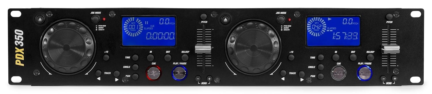 Le PDX350 est un double lecteur CD/MP3/USB disposant d'une mémoire anti-chocs, d'une boucle continue sur chaque lecteur avec fonction Reloop, le tout avec un superbe look. Le grand affichage LCD avec rétro-éclairage bleu affiche toutes les informations importantes. Le PDX350 a une molette ergonomique à triple fonction, un démarrage instantané, un CUE avec préview et deux ports USB universels.
