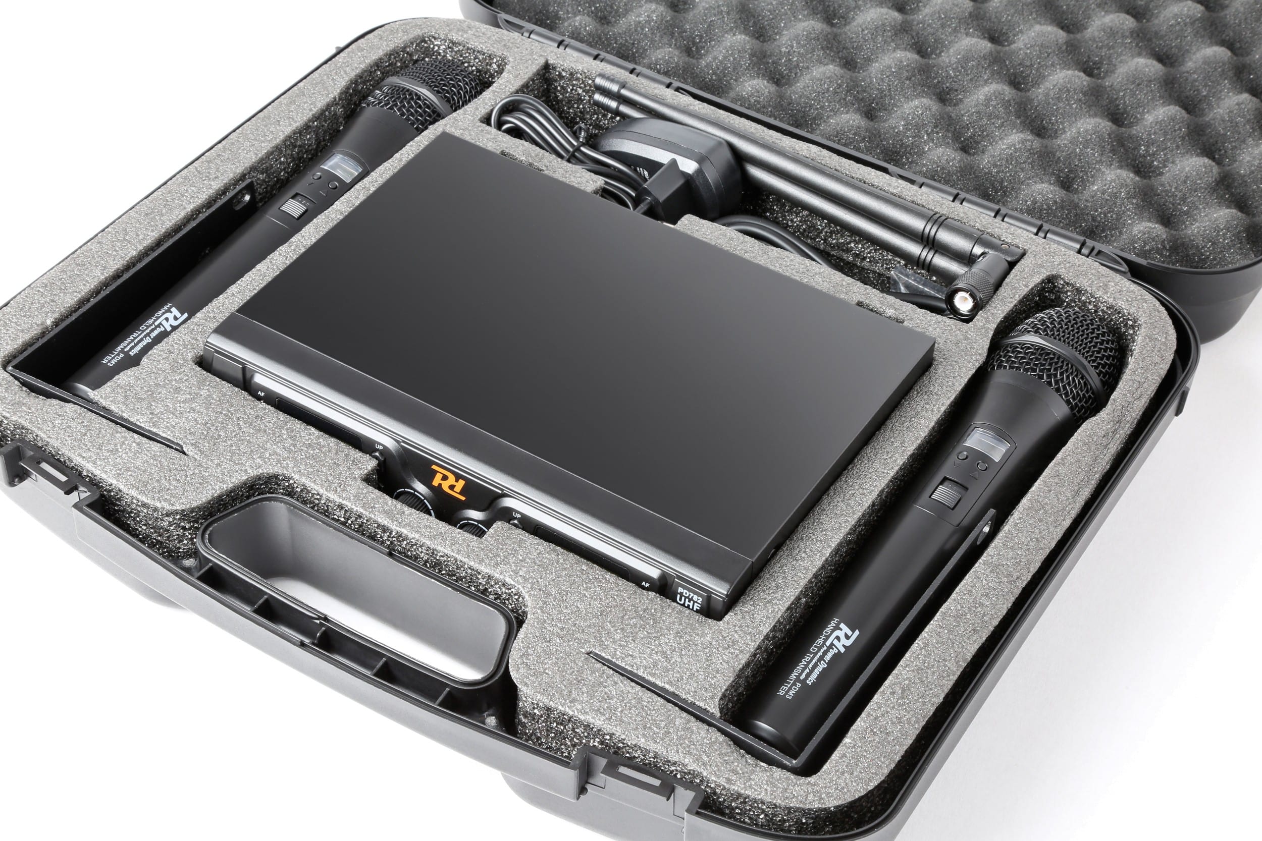 Un système professionnel UHF 2x 8 canaux avec 2 micros main. Avec affichage LCD sur le micro main pour sélectionner facilement un autre canal pour une transmission sans interférences. Le micro fonctionne dans la plage 863-865 MHz. Idéal sur scène, pour des présentations, chants...