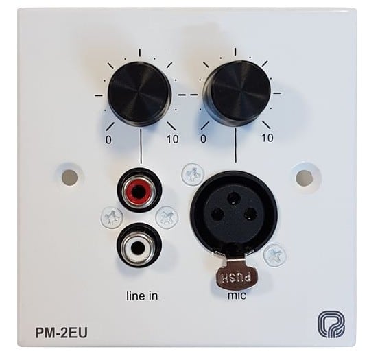 Préamplificateur et mixeur de petite taille, encastrable (boîte universelle) avec entrée micro et entrée auxiliaire, réglage individuel du volume et sortie mixte 0 dB. Convient pour faciliter la connexion décentralisée des sources sonores dans les halls, les salles de réunion, les salles de classe...