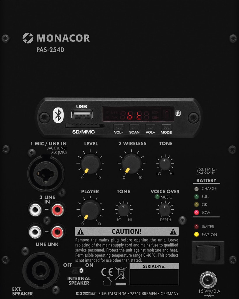 - 1 entrée par prise combi Mic (XLR)/Ligne (jack 6,35), réglage de gain, égaliseur, entrée Mic avec alimentation fantôme 12 V