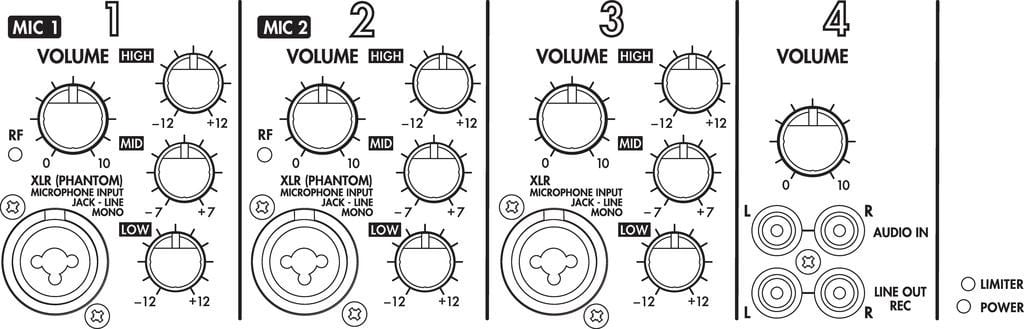 • 3 entrées par prise combo Mic (XLR) / Ligne (jack 6,35) avec égaliseur 3 voies et réglage de gain