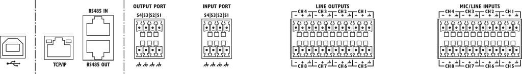 • 8 entrées et 8 sorties (bornier à vis, Mic/Ligne commutable, symétrique)