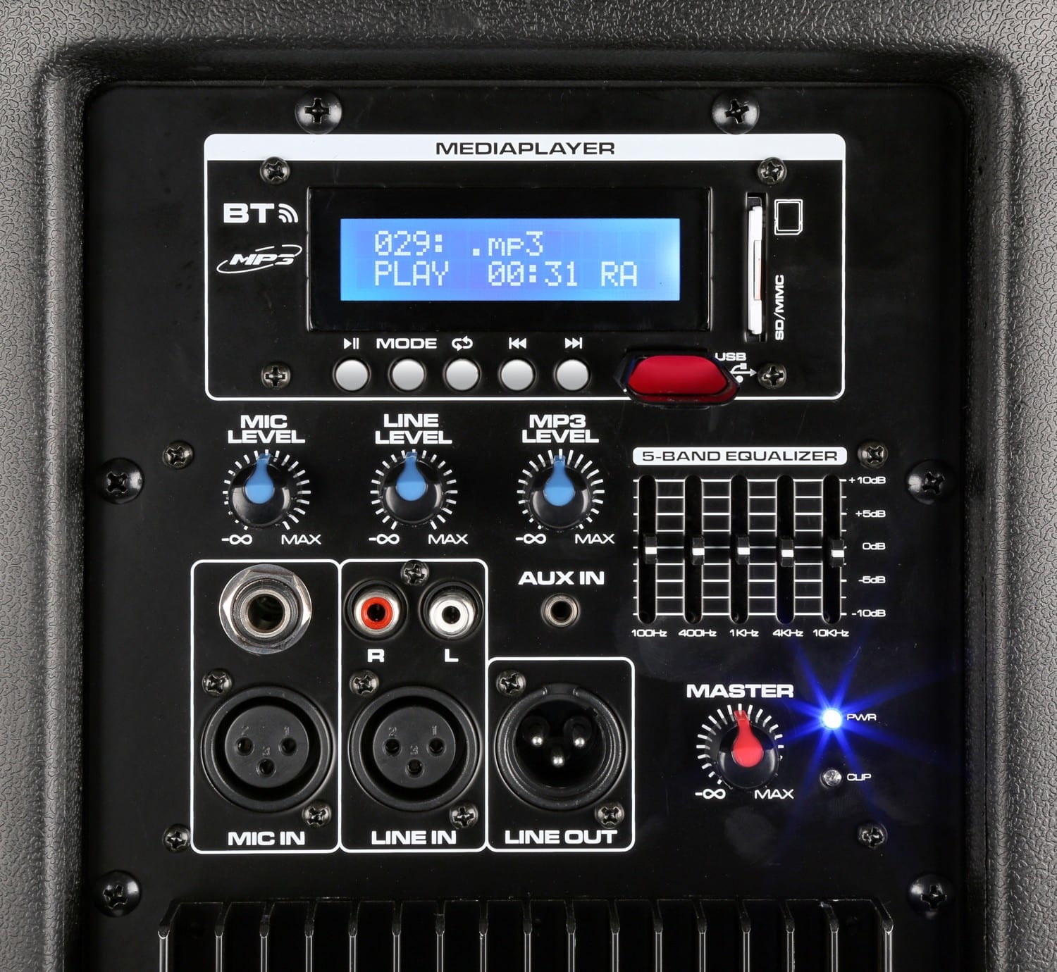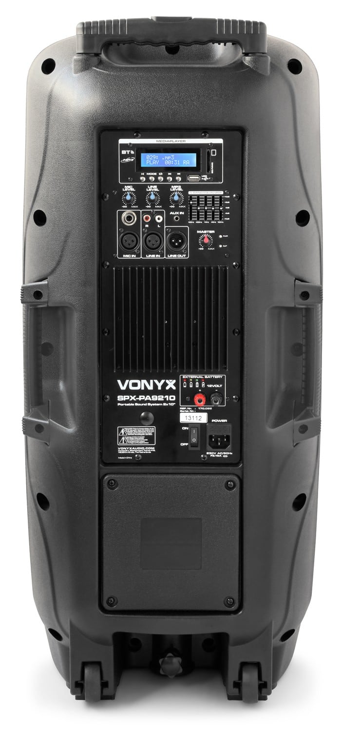 Un système de sono portable double 10" professionnel avec récepteur BT, 2 microphones UHF et inserts SD pour lecture MP3. Ce système tout en un, fonctionne sur secteur ou via l'accumulateur interne 12 V rechargeable. Sur la face arrière, entrées pour micro filaire (jack 6,35 et XLR), entrée ligne AUX (jack 3,5), entrée ligne stéréo (RCA et XLR) et une sortie (XLR ) pour brancher une seconde enceinte active. Grâce à cet appareil, vous disposez d'un son superbe dans tout type de lieu. Le SPX-PA9210 est également livré avec un trolley et une poignée télescopique.