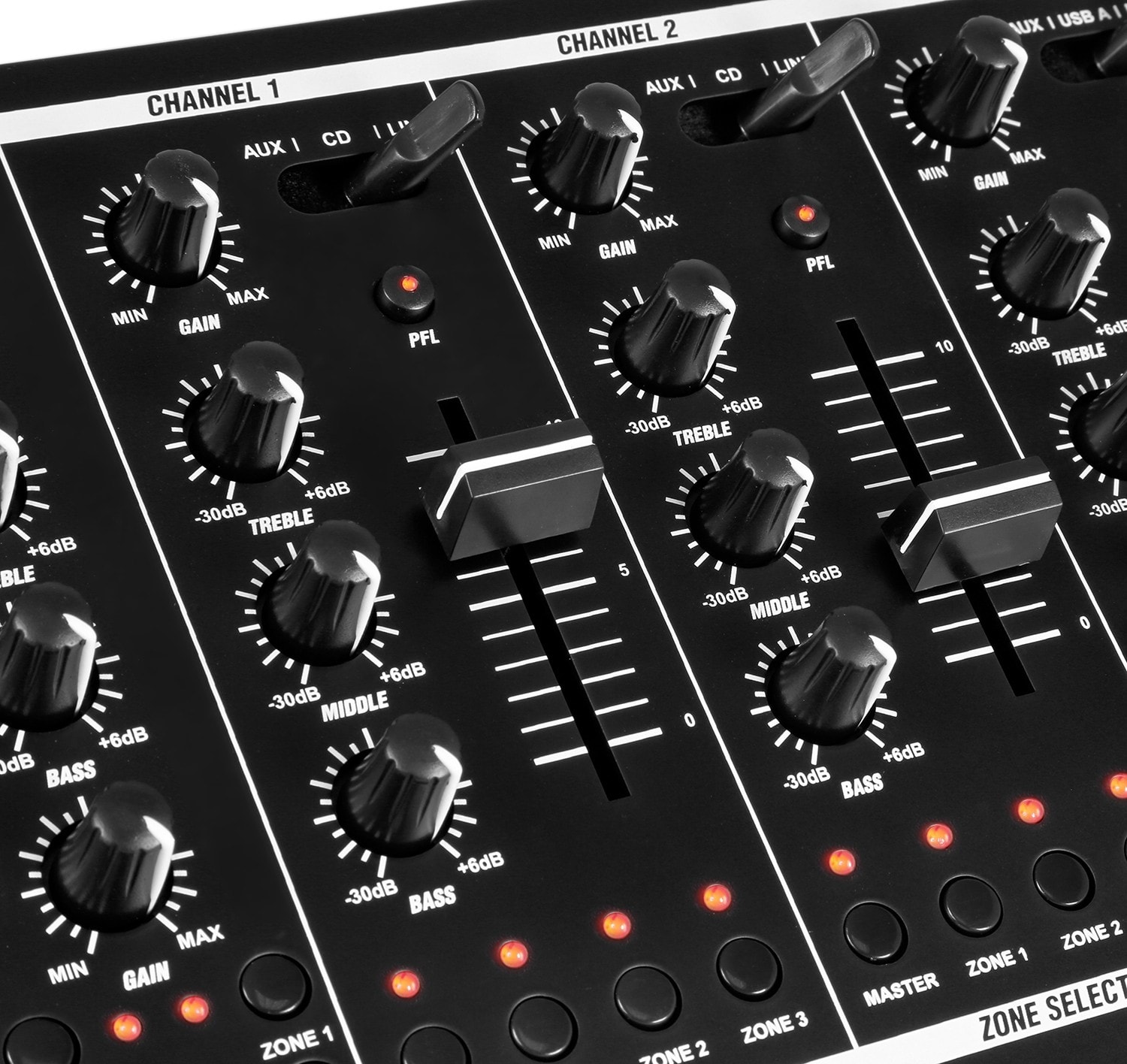 Le PDZM700 est un mixeur professionnel à 4 zones conçu pour offrir un contrôle audio flexible et fiable dans les bars, restaurants, clubs et salles d’événements. Avec quatre zones de sortie indépendantes, il permet de gérer le volume sonore de plusieurs espaces depuis une seule unité centrale. Le PDZM700 propose de nombreuses options d’entrée, notamment des connexions Ligne, AUX et Microphone, offrant une grande polyvalence. Chaque canal est équipé d’un égaliseur 3 bandes et d’un réglage de gain pour un contrôle précis du son. Son interface audio USB double permet de connecter un ou deux ordinateurs simultanément, idéale pour les DJs ou la musique d’ambiance. Le panneau avant clair et ergonomique offre un accès rapide aux sélecteurs d’entrée, aux faders, au monitoring PFL et aux Vu-mètres pour un contrôle précis du niveau. Des réglages de volume séparés par zone et un commutateur Stéréo/Mono garantissent une flexibilité maximale. Monté dans un boîtier rack 19 pouces robuste, le PDZM700 allie performance professionnelle, son clair et simplicité d’utilisation. Il constitue la solution idéale pour les installations audio multizones et les environnements professionnels.