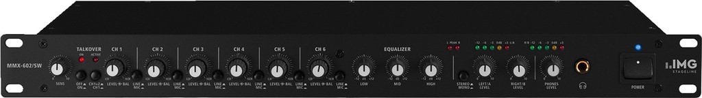 - 6 entrées Ligne stéréo, 6 entrées micro mono symétriques, commutables