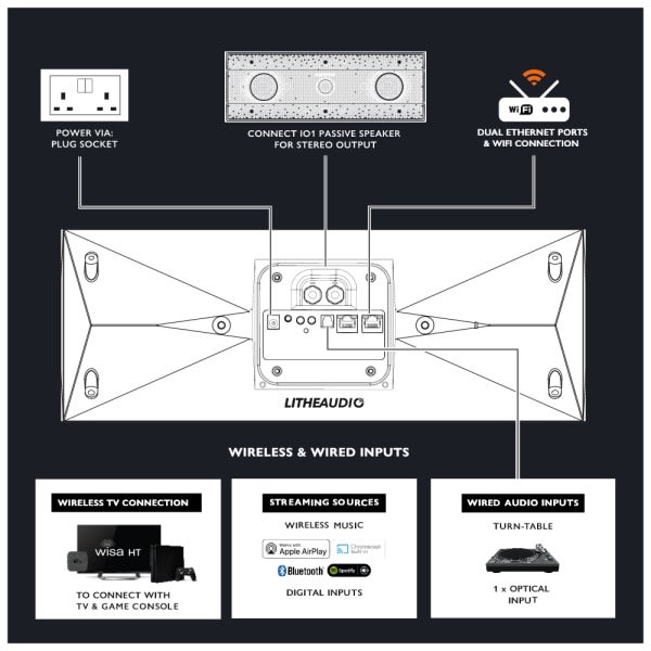 L'enceinte Lithe Audio iO1 offre une utilisation polyvalente et peut être utilisé à l'intérieur comme à l'extérieur. Vous pouvez vous connecter à l'enceinte soit sans fil, soit par l'intermédiaire d'un câble RJ45.