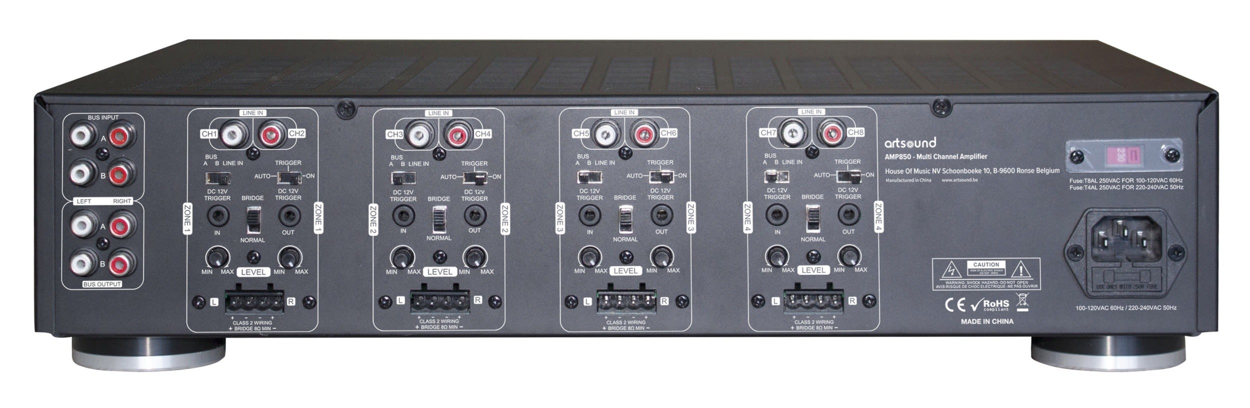 l'AMP850 est un amplificateur multicanal qui vous permet de piloter jusqu'à huit (mono) ou quatre (stéréo) zones de haut-parleurs . Chaque zone de haut-parleurs stéréo bénéficie de la puissance de 2 x 50 Watts