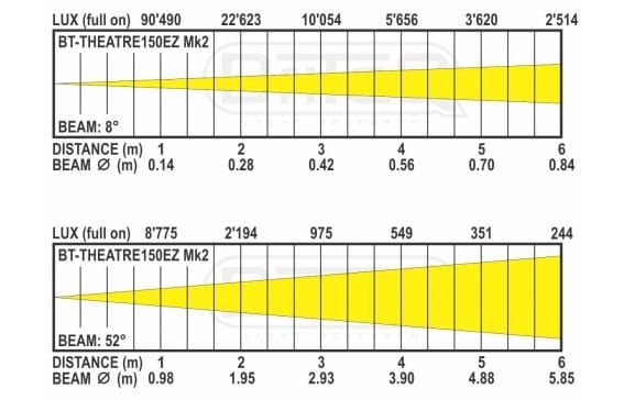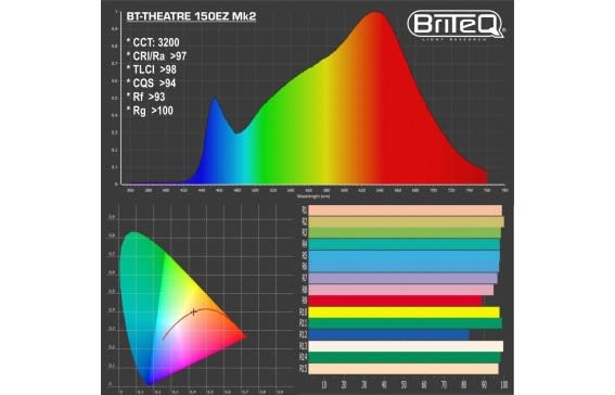 Spot de théâtre à LED extrêmement puissant avec zoom électronique : angle de faisceau de 8° à 52°. La LED 150W « blanc chaud » 3200K génère un rendement lumineux incroyable qui surpasse facilement celui des projecteurs de théâtre halogènes traditionnels de 1kW ! Excellentes caractéristiques photométriques : CRI / Ra >97, TLCI >98, CQS >94, Rf >93, Rg >100 ! Porte-filtres pour l’utilisation de filtres de couleur et coupe-flux à huit volets inclus, Plus besoin de blocs de variateur lourds et coûteux ! Système de refroidissement retravaillé pour un fonctionnement extrêmement silencieux, une température de LED faible et un rendement lumineux très stable Écran LCD pour naviguer facilement dans le menu de configuration retravaillé! Contrôlé par DMX : 6 modes de canal différents (gradation 8 bits et 16 bits) pour un maximum de flexibilité. Préparé pour le DMX sans fil: il suffit de brancher un DONGLE WTR-DMX ! (Briteq® code: 4645) Enregistrements TV sans scintillement et sans bruits de gradateur, grâce à la gradation HF PWM: jusqu'à 20kHz! Réglage manuel de la gradation et de la mise au point: alignement facile du projecteur sur scène + utilisation sur les stands d'exposition. La lampe peut être réglée de façon continue pour imiter le comportement d’une lampe LED à halogène. Quatre courbes de variation de l’intensité : linéaire, carré, carré inversé, courbe en S En cas d’échec DMX, les modes « tout éteint » ou « maintien » resteront disponibles. Fonctionnalité RDM pour faciliter la configuration à distance : Adressage DMX, mode canal, ... Fonction de verrouillage afin d’empêcher les modifications indésirables de la configuration. Les réglages par défaut d’usine et les réglages personnels peuvent être mémorisés/chargés. Entrées/sorties DMX à 3 et 5 broches + entrées/sorties d’alimentation Neutrik PowerCON pour un chaînage facile. Spot de théâtre à LED extrêmement puissant avec zoom électronique : angle de faisceau de 8° à 52°. La LED 150W « blanc chaud » 3200K génère un rendement lumineux incroyable qui surpasse facilement celui des projecteurs de théâtre halogènes traditionnels de 1kW ! Excellentes caractéristiques photométriques : CRI / Ra >97, TLCI >98, CQS >94, Rf >93, Rg >100 ! Porte-filtres pour l’utilisation de filtres de couleur et coupe-flux à huit volets inclus Plus besoin de blocs de variateur lourds et coûteux ! Système de refroidissement retravaillé pour un fonctionnement extrêmement silencieux, une température de LED faible et un rendement lumineux très stable Écran LCD pour naviguer facilement dans le menu de configuration retravaillé! Contrôlé par DMX : 6 modes de canal différents (gradation 8 bits et 16 bits) pour un maximum de flexibilité. Préparé pour le DMX sans fil: il suffit de brancher un DONGLE WTR-DMX ! (Briteq® code: 4645) Enregistrements TV sans scintillement et sans bruits de gradateur, grâce à la gradation HF PWM: jusqu'à 20kHz! Réglage manuel de la gradation et de la mise au point: alignement facile du projecteur sur scène + utilisation sur les stands d'exposition. La lampe peut être réglée de façon continue pour imiter le comportement d’une lampe LED à halogène. Quatre courbes de variation de l’intensité : linéaire, carré, carré inversé, courbe en S En cas d’échec DMX, les modes « tout éteint » ou « maintien » resteront disponibles. Fonctionnalité RDM pour faciliter la configuration à distance : Adressage DMX, mode canal. Fonction de verrouillage afin d’empêcher les modifications indésirables de la configuration. Les réglages par défaut d’usine et les réglages personnels peuvent être mémorisés/chargés. Entrées/sorties DMX à 3 et 5 broches + entrées/sorties d’alimentation Neutrik PowerCON pour un chaînage facile.