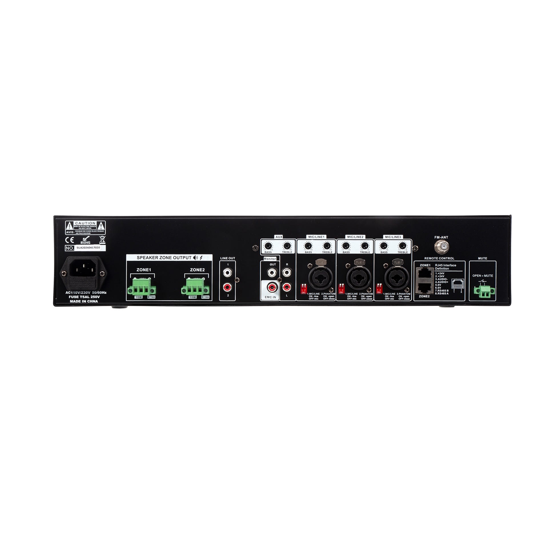 Cet amplificateur matriciel offre une flexibilité maximale. Il permet de diriger simultanément ou indépendamment l’une des 8 sources proposées vers deux zones distinctes. Parmi ses sources se trouve un module DAB+/FM/ BT. La puissance de chaque zone est 240 W sous 100 V ou 8 ohms