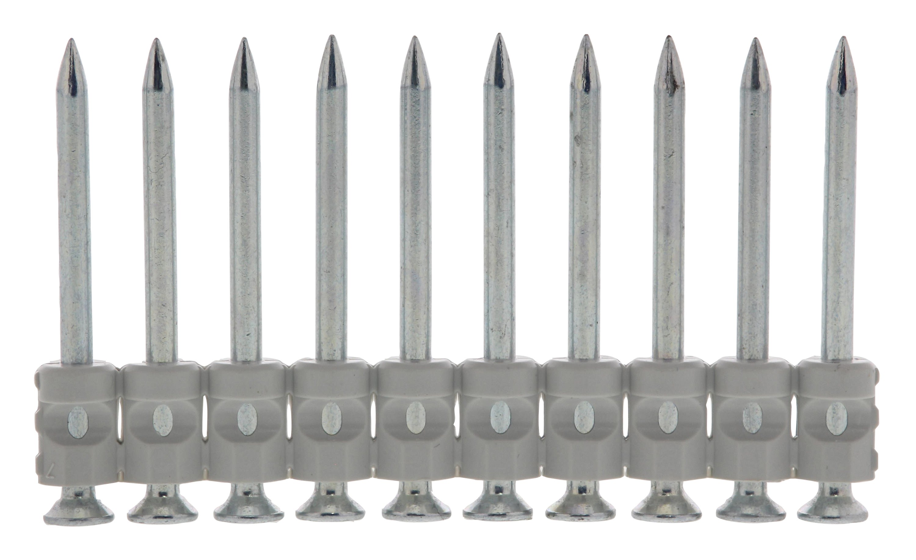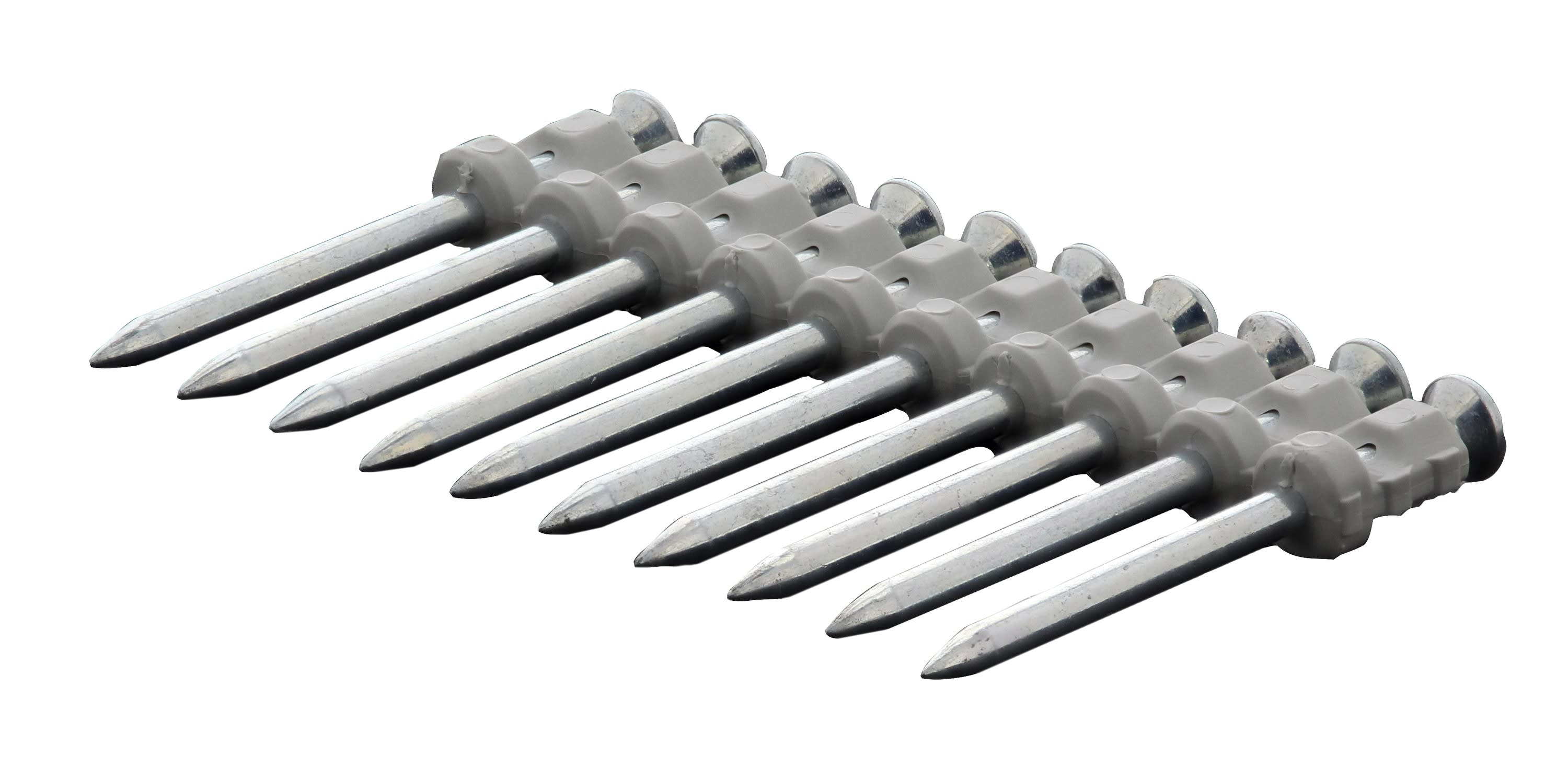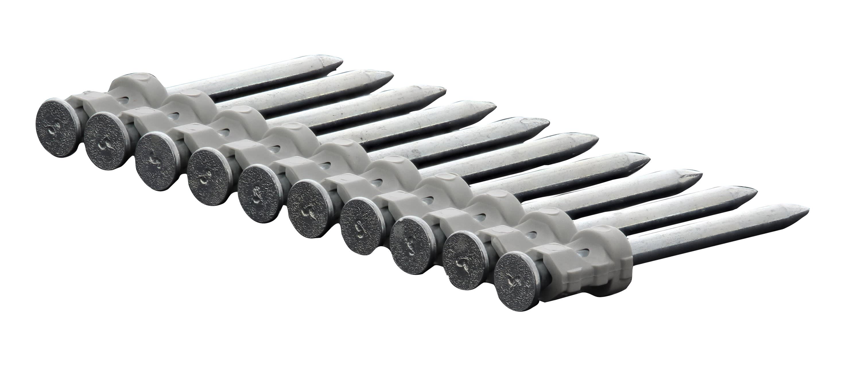 Avantages produit: La bande plastique du clou se détache pour laisser le clou à fleur de l'élément fixéDescription produit: Clous pour semelle bois dans le bétonApplications: Semelles boisAutonomie cartouche de gaz: 625 tirsDiamètre de la tête: 6.3 mmDiamètre nominal: 2.6 mmNombre de clou par bande/rouleaux: 10 piècesPas de filetage: 6.87 mm