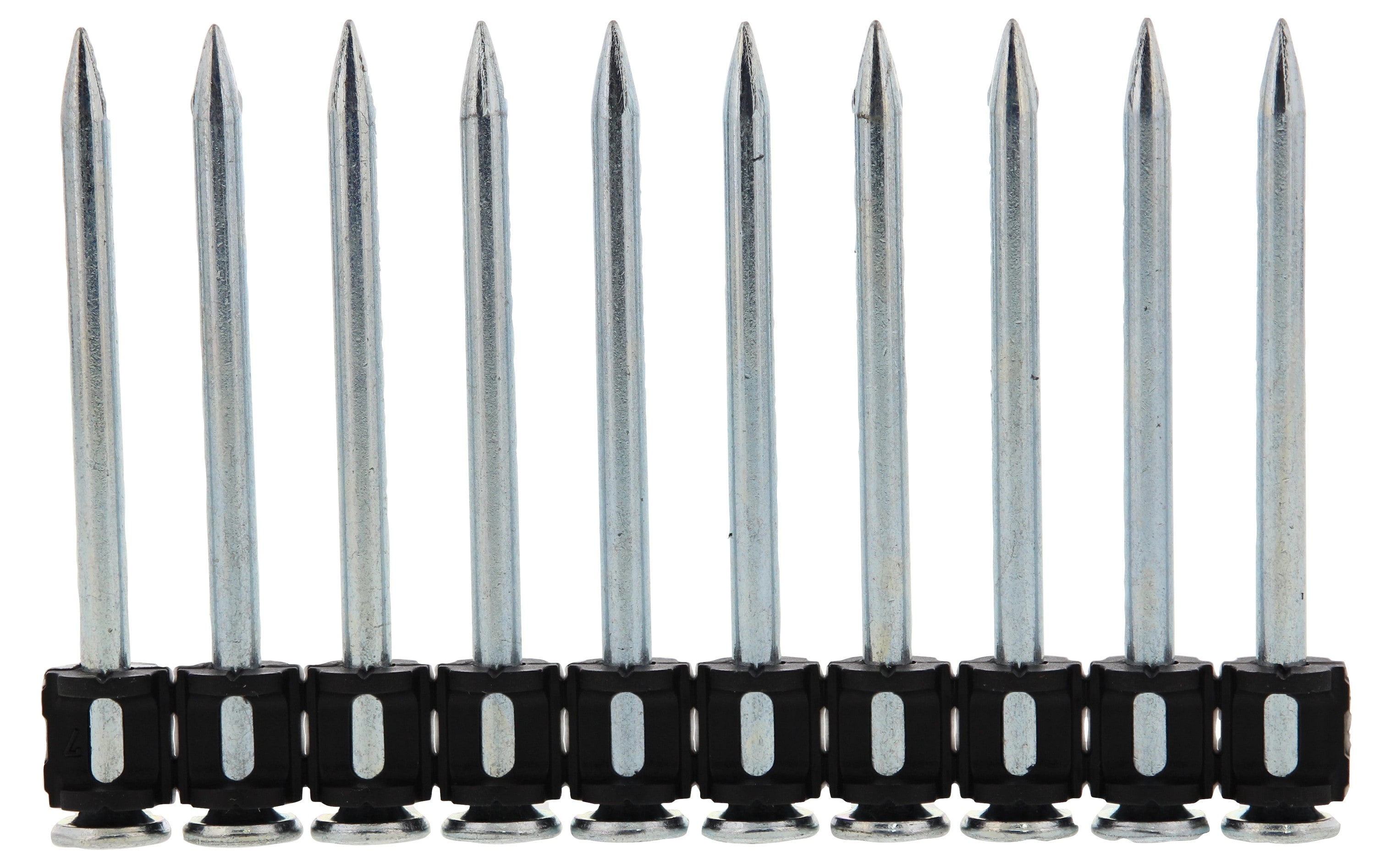 Description produit: Clou pour bétonDiamètre de la tête: 8.8 mmDiamètre nominal: 3.65 mmLongueur de fixation (clou/agrafe/pointe): 50 mmNombre de clou par bande/rouleaux: 10 piècesPas de filetage: 9.5 mm