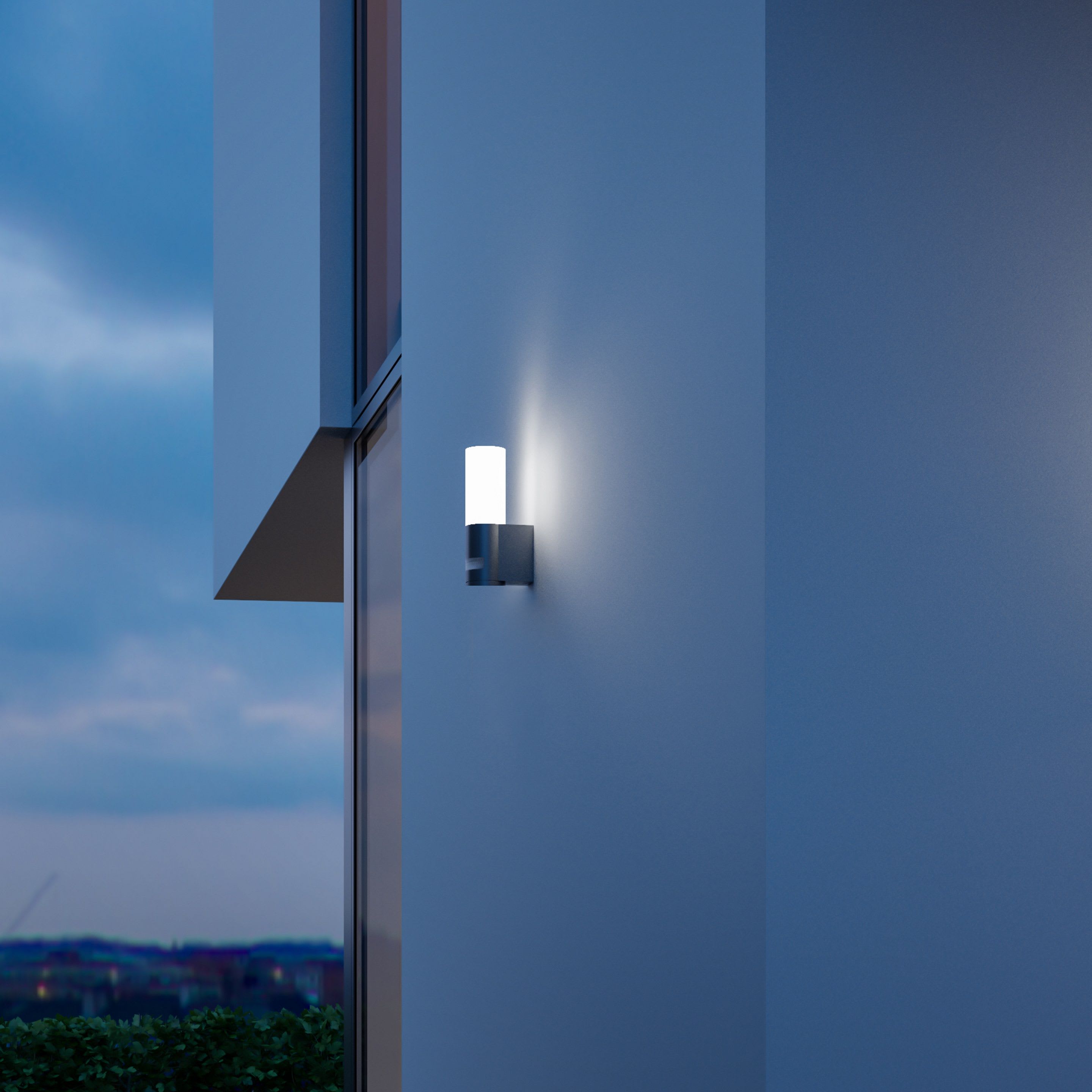 Applique d’extérieur L 605 LED S, détecteur infrarouge de 180°, portée de 10m, base en aluminium, corps en verre opale, lumière 3000K, 600lm, 9,5W, seuil de déclenchement & temporisation réglable ainsi, marche forcée, balisage.