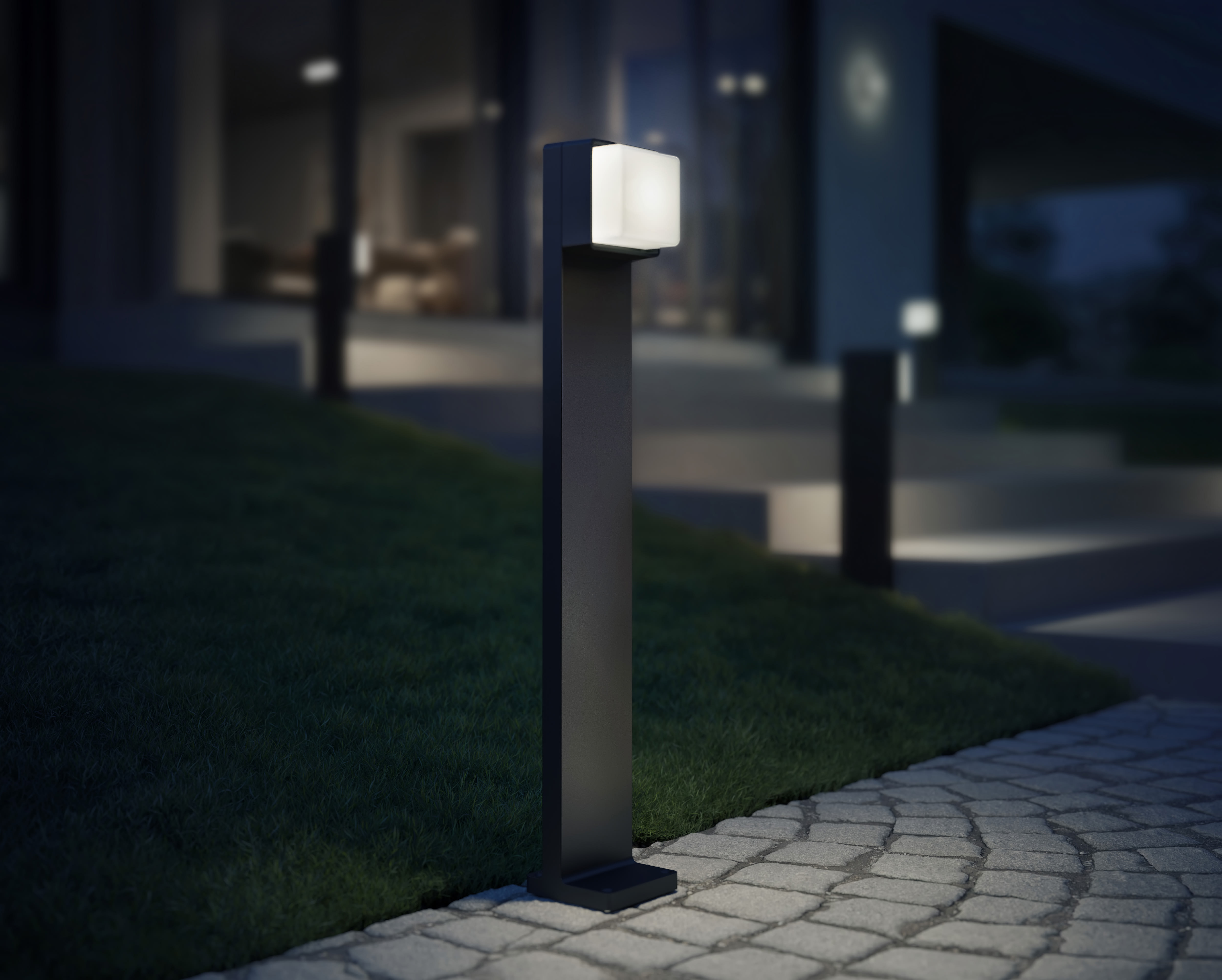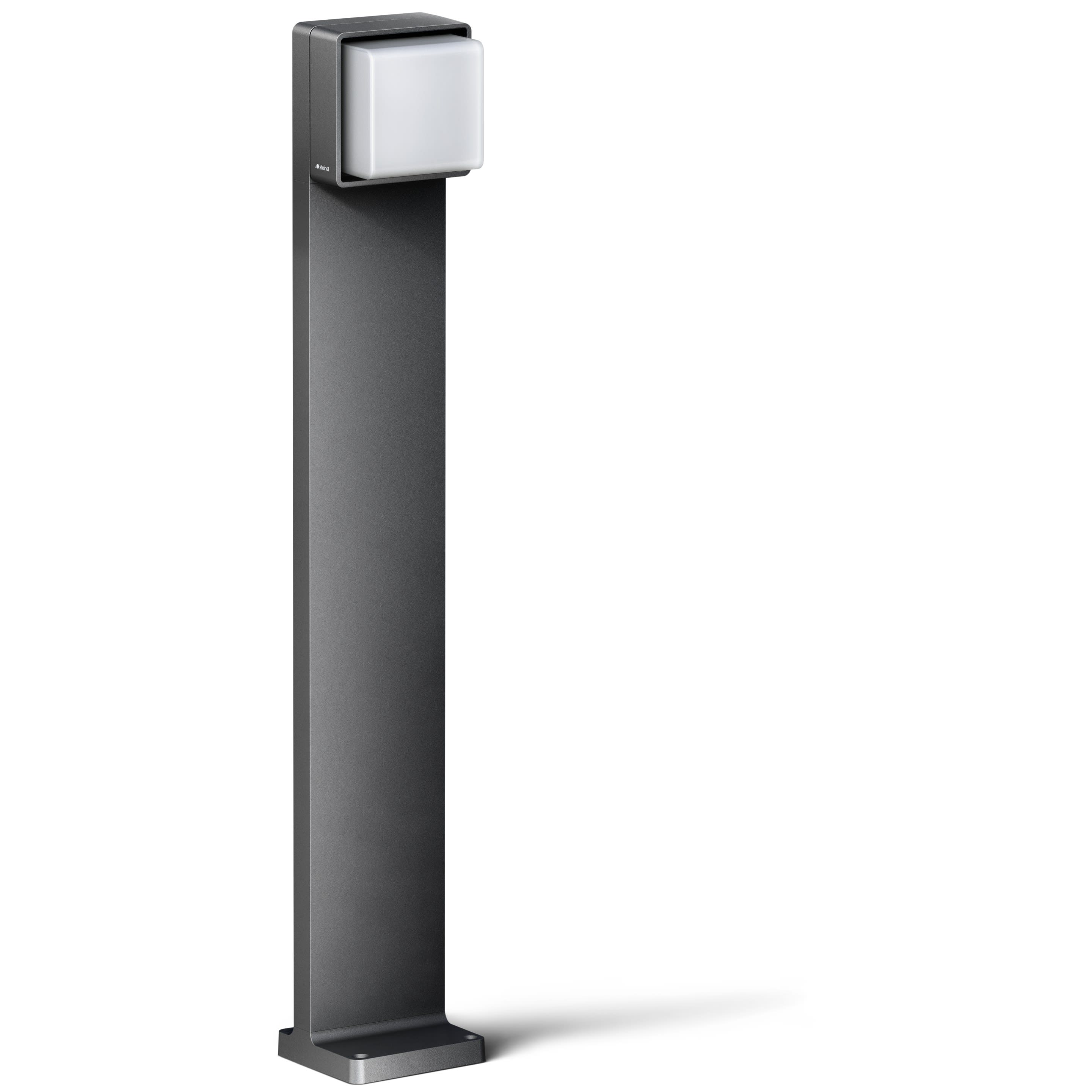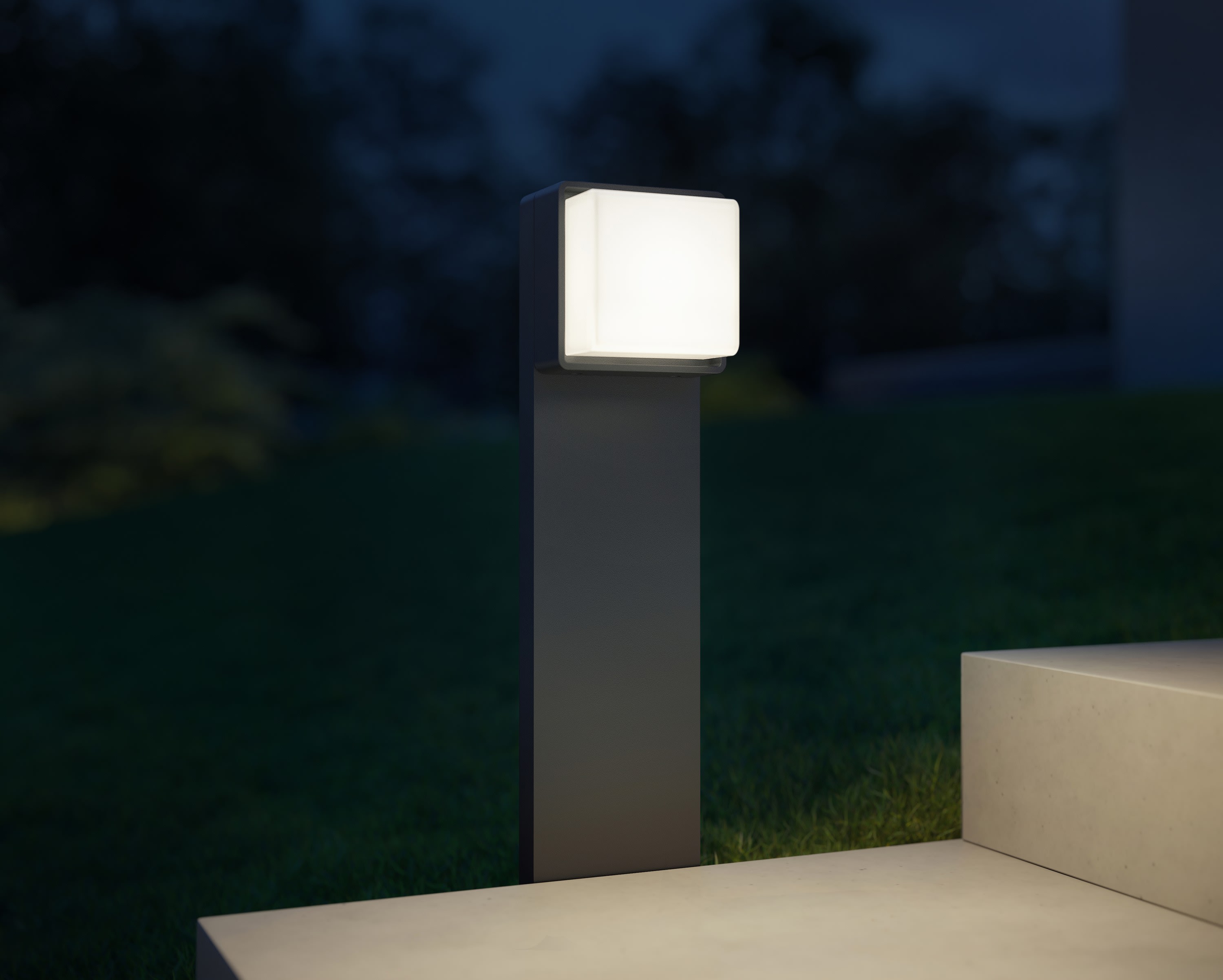 Éclairage connecté – Lampadaire innovateur de qualité supérieure. Le lampadaire en aluminium GL 85 SC de la série Cube Pro vous accompagne en toute sécurité et avec style la nuit sur les allées tout autour du domicile. Avec son design cubique sobre et attrayant, le luminaire de 3000 K et 719 lm confère à vos espaces extérieurs une touche lumineuse moderne et une valeur architecturale à votre résidence. La mise en service, le réglage et la mise en réseau sans fil sont un jeu d’enfant grâce au système Bluetooth Mesh et à l’appli gratuite STEINEL Connect. Le capteur à haute fréquence 160° est invisible et son rayon porte jusqu'à 5 mètres, pouvant être calibré rapidement et avec précision de manière digitale. La connexion sans fil Bluetooth avec fonction de groupes voisins permet à la lumière d’anticiper et d’éclairer uniformément et en toute sécurité les allées et les entrées. Le luminaire extérieur de qualité supérieure est équipé d'un allumage en douceur, de LED de balisage (10-100%) ainsi que d'un éclairage principal à intensité variable (10-100%), de façon à composer différents scénarios lumineux adaptés et à économie d'énergie. Deux tailles – 60 cm et 90 cm – sont disponibles. L'attrayant luminaire existe aussi sans capteur. Le pied et profilé de support sont disponibles comme pièces de rechange.