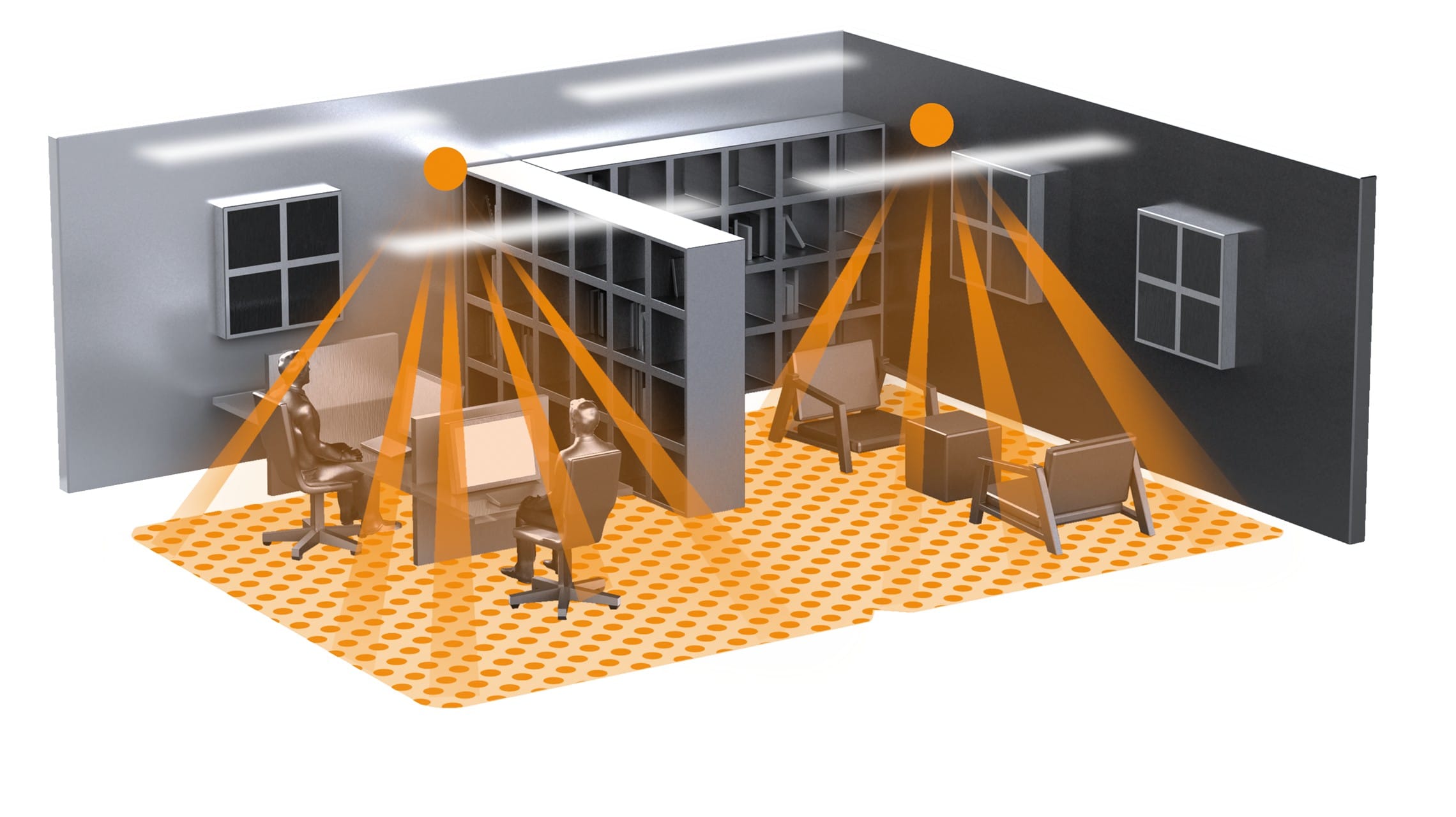 Le système Control PRO couvre au mieux le spectre des domaines d'utilisation en utilisant la technologie de détection infrarouge, hyperfréquence et à ultrasons et s'adapte parfaitement à toutes les configurations de l'espace. Jusqu'à 4800 zones de détection permettant de détecter les moindres mouvements. Une temporisations automatiques grâce au mode intelligent d'auto-apprentissage IQ. Disponible dans les interfaces COM1, COM2, DALI-2, KNX ou LiveLink. De plus, la commande peut être effectuée par télécommande IR.