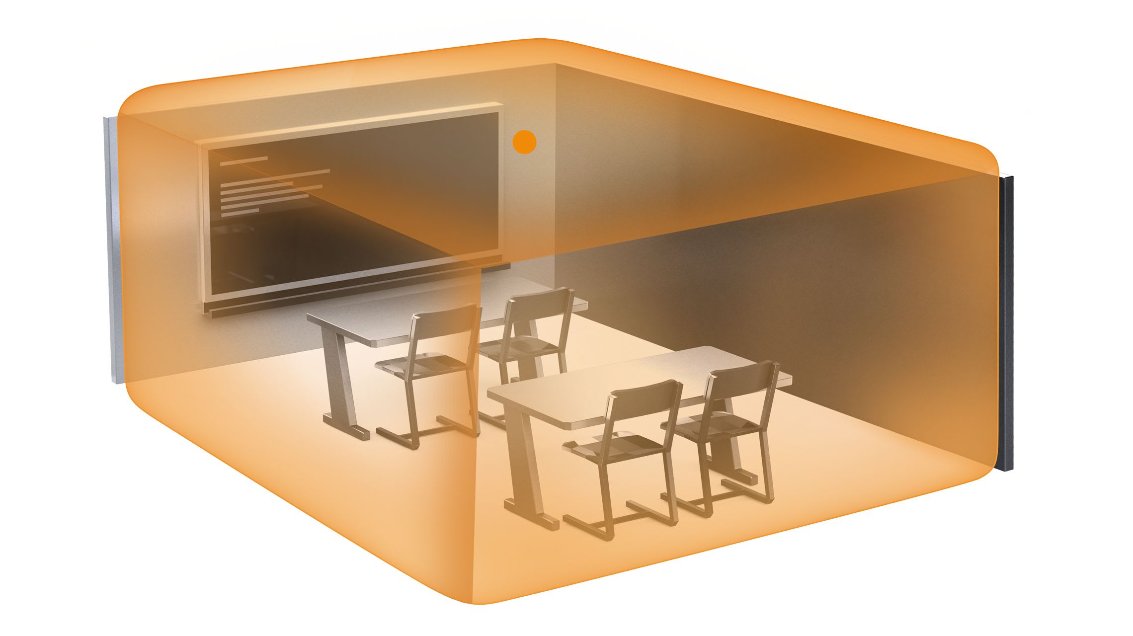 Une détection sans obstacle. Une surveillance dans les moindres recoins et une sensibilité remarquable. Une architecture avec de nombreux recoins, des cloisons ou d'autres obstacles présente des difficultés insurmontables à de nombreux détecteurs. La détection de la présence humaine dynamique idéale du modèle US 360 fonctionne, au contraire, de manière absolument fiable, même derrière des objets. Sur 6 x 6 mètres. Et cela même à des températures extrêmes. Les ondes ultrasonores qui remplissent une pièce le permettent.