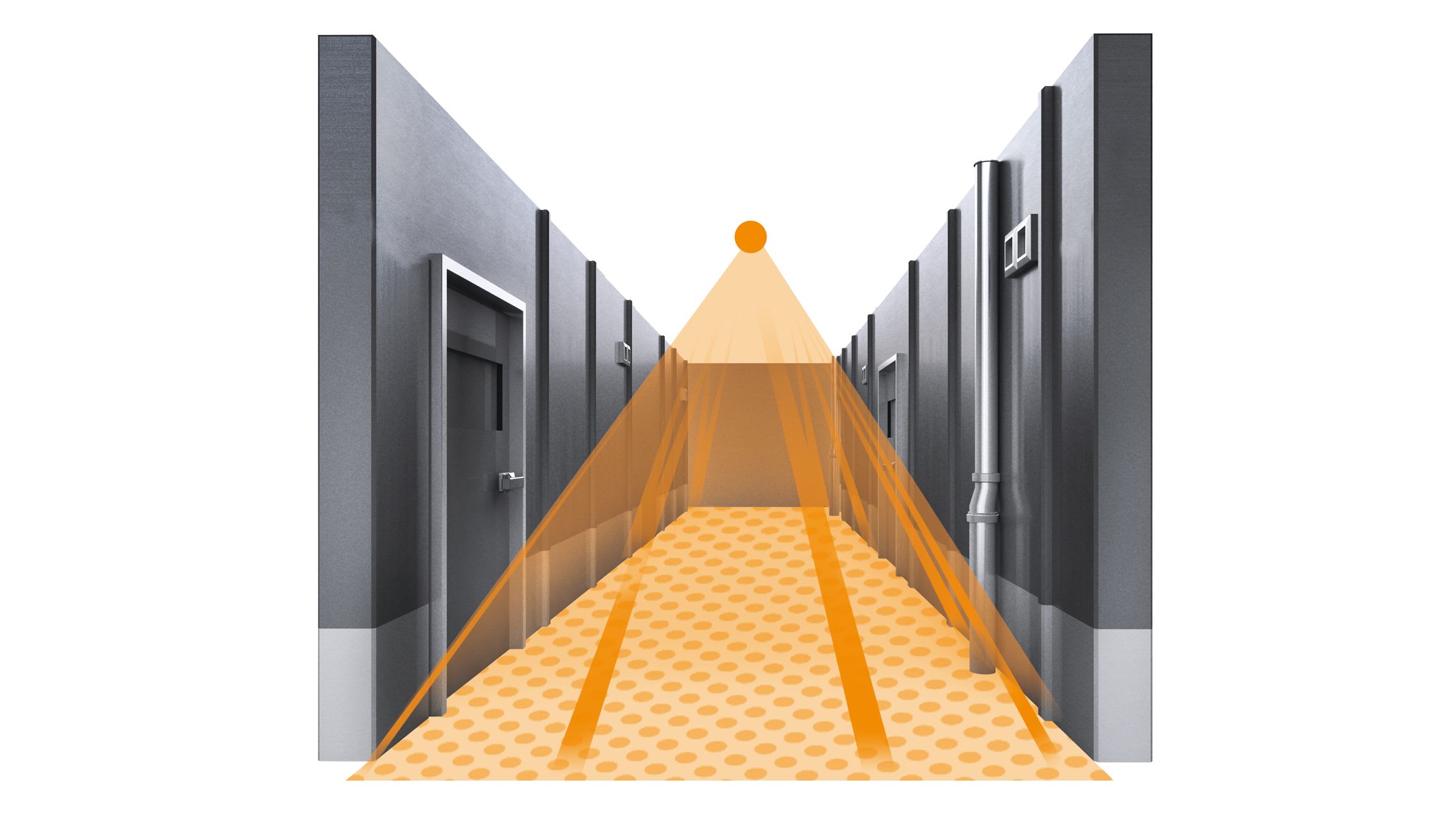 Des capteurs qui ouvrent la voie. Une détection ciblée. Les couloirs et les longs corridors ont des exigences particulières en matière de performance des capteurs. Le champ de détection du capteur doit être étroit mais long. C'est la seule façon de couvrir de longs tronçons de manière ciblée avec le moins de capteurs possible. L'IS 345 est le spécialiste maintes fois éprouvé pour de telles applications en intérieur. Il dispose d'une détection spéciale des allées et d'un angle d'ouverture de 45°. Il surveille ainsi jusqu'à 23 x 6 mètres de manière tangentielle.