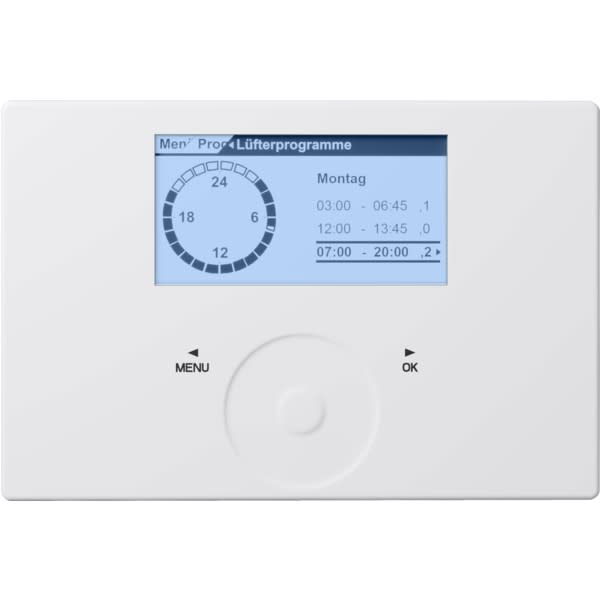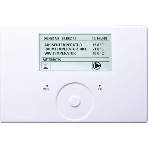 Commande à molette tactileÉcran graphique rétro-éclairéMesure de la température ambiante et de l’humiditéCouplage de données par bus systèmeChoix du mode de fonctionnement