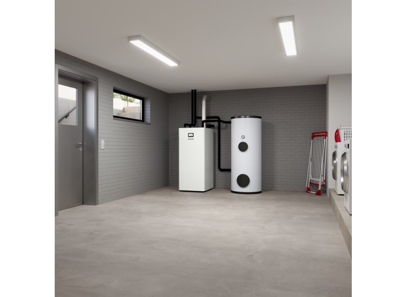 Pompe à chaleur eau glycolée-eau à technologie Inverter, installée en intérieur pour le chauffage et la production d’eau chaude sanitaireFluide frigorigène naturel R290, durable et écologique