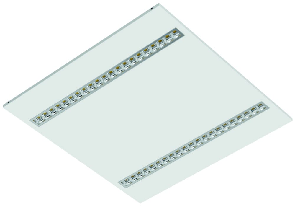 La Dalle à haute efficacité (jusqu‘à 140Im/W), à couleur commutable, utilise la technologie de module en barette LED à faible éblouissement pour reproduire l‘apparence des luminaires directs/indirects traditionnels.
