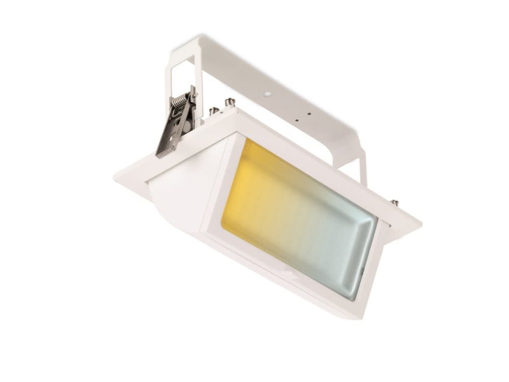 L‘encastré, baculant à 70°, permet de s‘adapter aux environnements changeants des points de vente. Produisant jusqu‘à 4300 lumens à partir d‘une LED de 42W, il remplace parfaitement les luminaires traditionnels à iodure métallique.