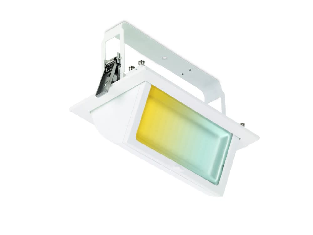 Encastré Rectangulaire LED Lèche-mur IP65 en aluminium, réglable et commutable, conçu pour mettre en valeur les présentoirs et les éléments muraux dans les applications intérieures et extérieures. Parfait pour les applications qui requièrent un éclairage de haute qualité et un rendu des couleurs supérieur (IRC>90). L‘encastré, baculant à 70°, permet de s‘adapter aux environnements changeants des points de vente. Produisant jusqu‘à 4300 lumens à partir d‘une LED de 42W, il remplace parfaitement les luminaires traditionnels à iodure métallique. Couleur commutable 3000K/3500K/4000K avec un angle de faisceau de 100°. Driver non-gradable et sans scintillement, précâblé pour faciliter l‘installation. Indice de protection IP65 en face avant, IP20 en face arrière.