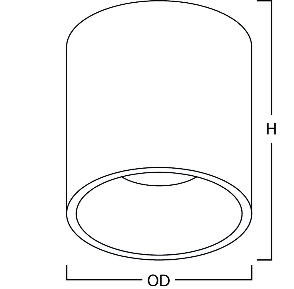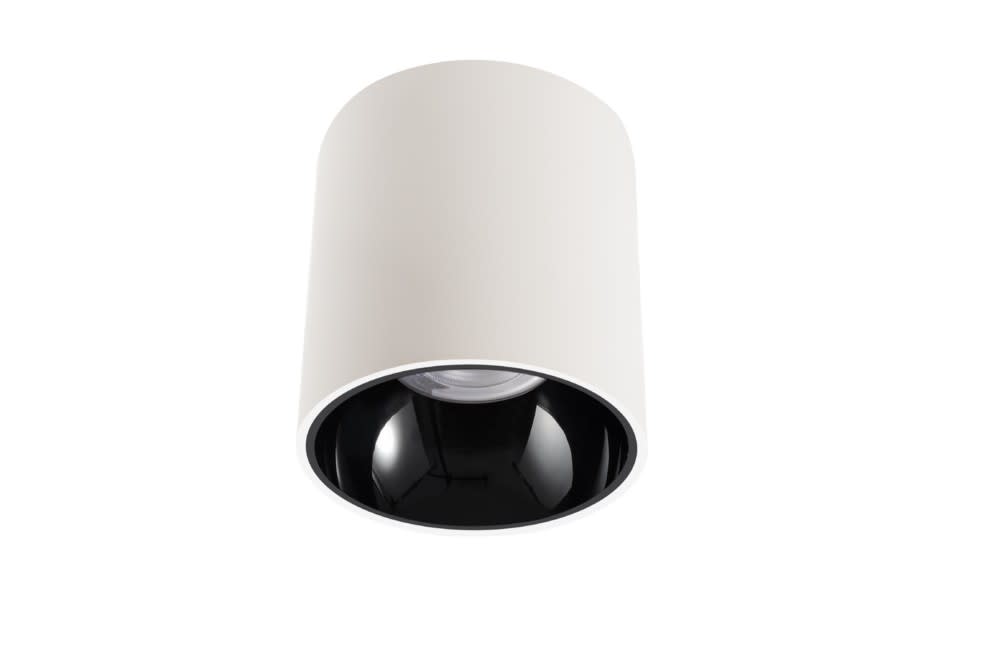 Plafonnier en saillie fixe rond de haute qualité basse-luminance, avec corps en fonte d'aluminium blanc et réflecteur de couleur onyx.