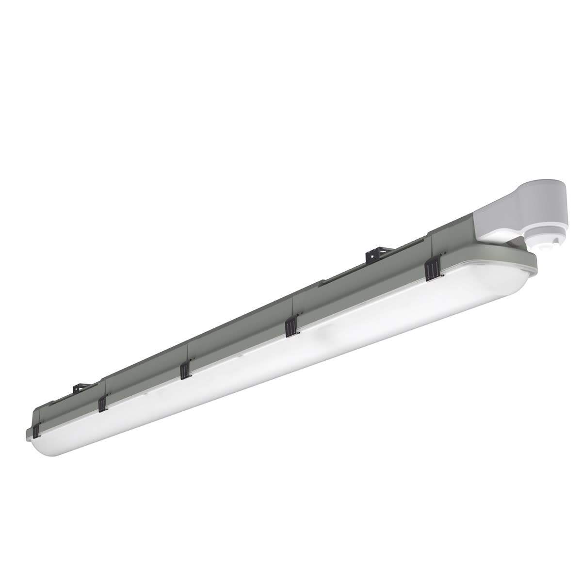Solution étanche Led en polycarbonate. Étriers coulissants et clips en inox 301 et platine LED fixée à la vasque. Vasque plate stabilisée aux UV, conçue pour un éclairage uniforme, optimiser le rendement lumineux et réduire l'éblouissement. Pré-perçage aux extrémités pour 1 ou 2 presse-étoupes et pré-perçage pour alimentation par le milieu. Température de couleur 4000K, IRC80. Flux lumineux sortant 2800lm. Puissance consommée 20W. Efficacité lumineuse : 140lm/W. Durée de vie (L80) : 69.000h. Système de gestion d'éclairage embarqué Bluetooth SylSmart Connected avec détection de la hauteur max 3,5m. Capteur PIR intégré. Risque photobiologique RG1, IP65, IK08. Test au fil incandescent 850°C. Températures de fonctionnement de -20°C à 40°C. Classe I. Certifié ENEC, Marquage D et IFS. Dimensions (LxlxH) : 1288x89x88mm. Poids : 1,86kg. Garantie 5 ans. Sylvania est signataire de la charte LED. Produit éligible CEE.