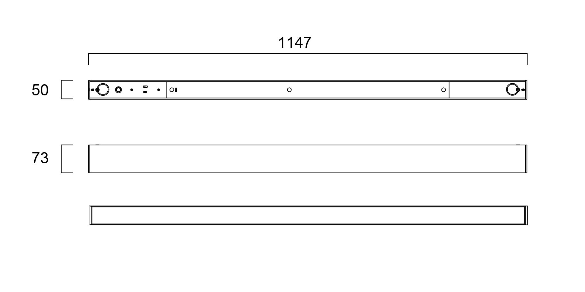 Luminaire LED linéaire pour installation encastré, en saillie, mural ou suspendu. Montage individuel ou en ligne continue. Profilé aluminium longueur 1147mm, largeur 50mm, hauteur 73mm. Finition noire (RAL9011). Diffuseur microprismatique permettant un faible éblouissement UGR<19. Driver multipower, puissance max 24W. Flux lumineux max 3360lm. Efficacité lumineuse 140lm/W. Température de couleur réglable à l'installation via un interrupteur à l'arrière du luminaire : 3000K / 4000K. IRC80. SDCM<3. Classe I. Indice de protection IP20. Résistance aux chocs IK03. Durée de vie 85 000 h (L80B20). Garantie 5 ans.