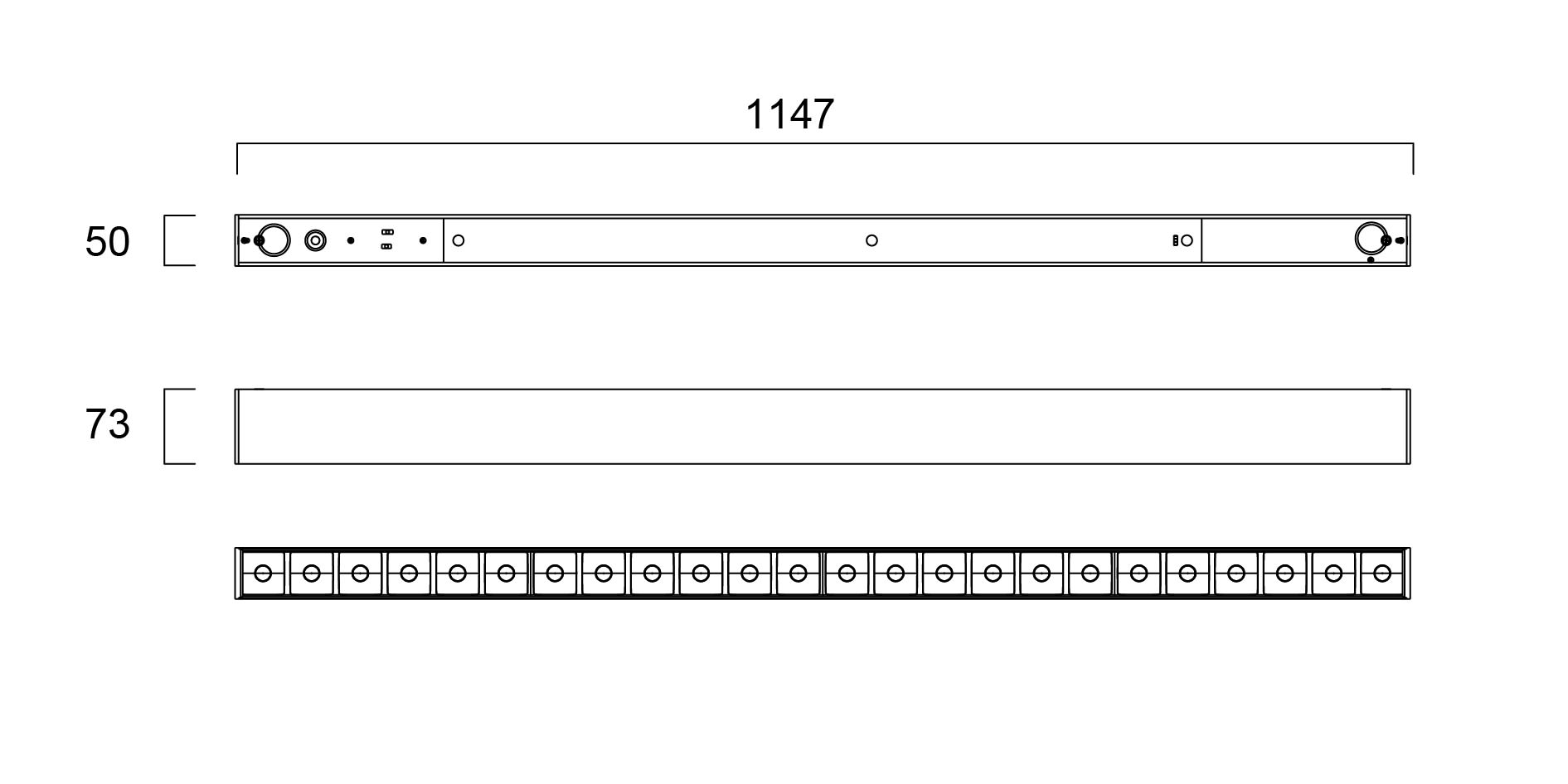 Luminaire LED linéaire pour installation encastré, en saillie, mural ou suspendu. Montage individuel ou en ligne continue. Profilé aluminium longueur 1147mm, largeur 50mm, hauteur 73mm. Finition noire (RAL9011). Optique avec réflecteurs noirs permettant un faible éblouissement UGR<19. Driver multipower, puissance max 24W. Flux lumineux max 3360lm. Efficacité lumineuse 140lm/W. Température de couleur réglable à l'installation via un interrupteur à l'arrière du luminaire : 3000K / 4000K. IRC80. SDCM<3. Classe I. Indice de protection IP20. Résistance aux chocs IK03. Durée de vie 85 000 h (L80B20). Garantie 5 ans.
