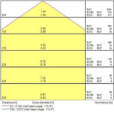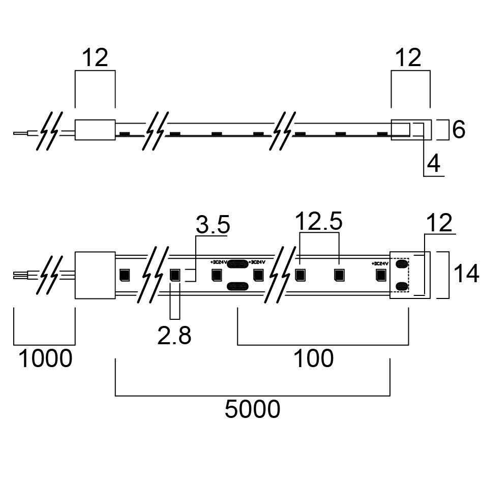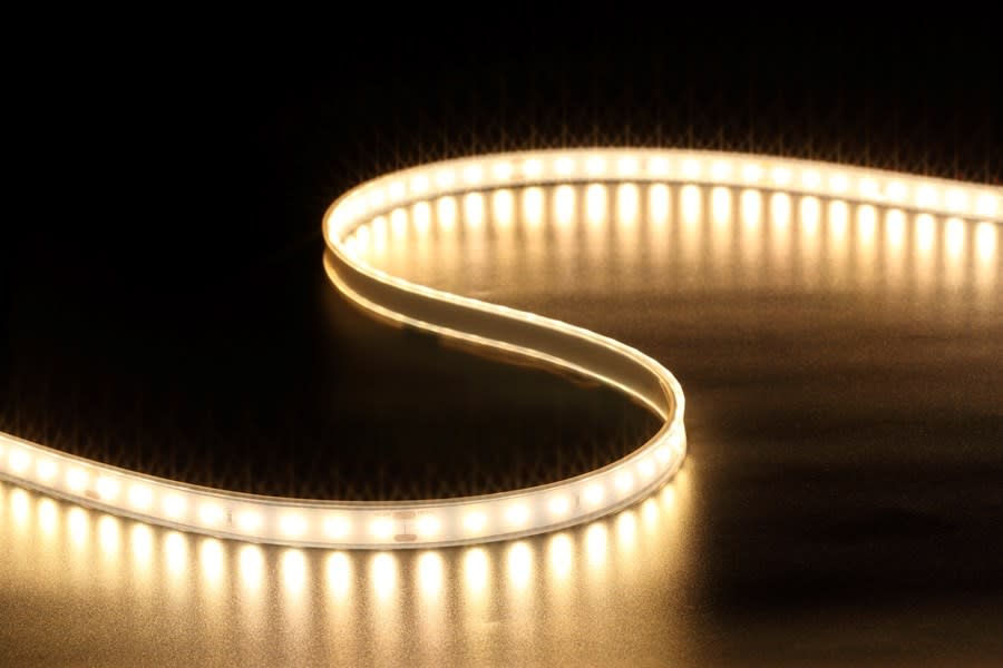 Ruban Led. Température de couleur (CCT) 3000K, IRC>90. Flux lumineux sortant 8250lm/5m, soit 1650lm/m. Nombre de LED pour 5m: 400. Puissance consommée 72W/5m. Efficacité lumineuse 115lm/W. Découpable tous les 10cm. Maintien du flux de L70B50: 50.000h. IP65. Classe III. 650°C.