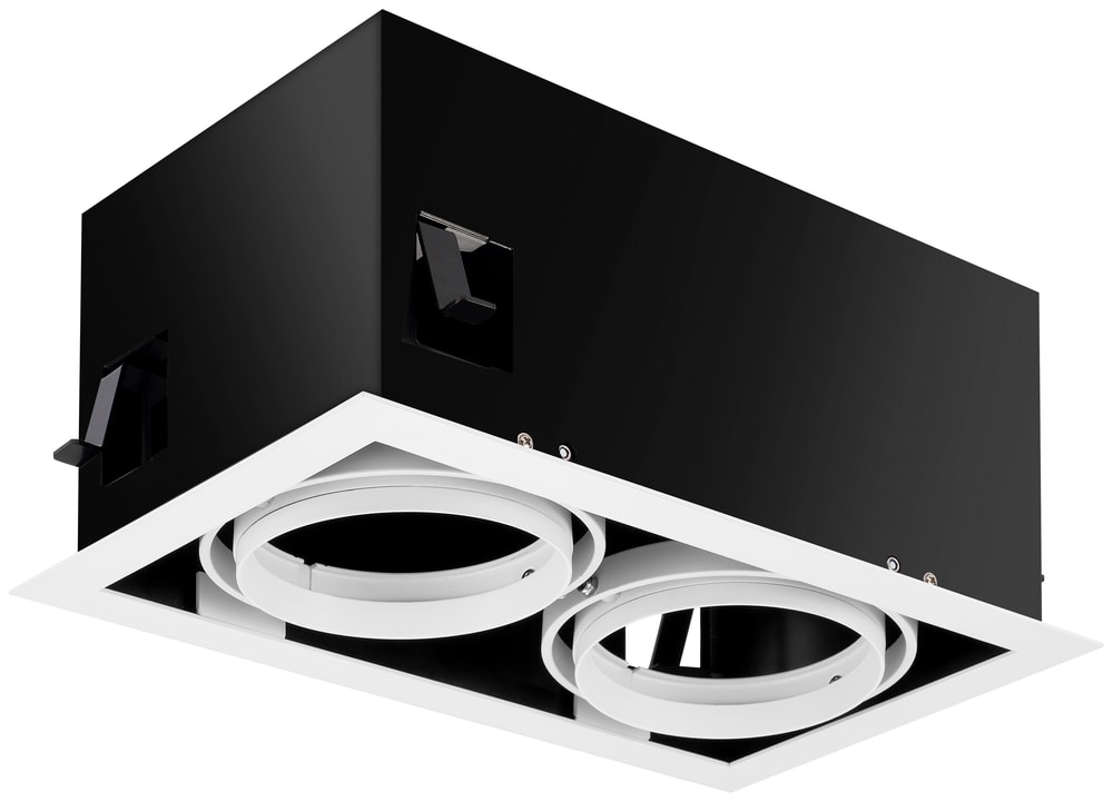 LUDOSPOT 111 Boitier CARR RECT X2 CARDAN BLA - Double boîtier encastré Ludospot diamètre 111mm. Module LED non inclus. Corps en aluminium moulé sous pression. Collerette rectangulaire pour 2 LUDOSPOT avec réflecteur blanc, réglable horizontalement à 35° avec système cardanique, inclinaison verticale 40°. Degré de protection IP20, couleur blanche RAL9016, dimensions extérieures sans module LED : 347x200x152mm, découpe 320x80mm. Convient uniquement pour l'environnement intérieur.